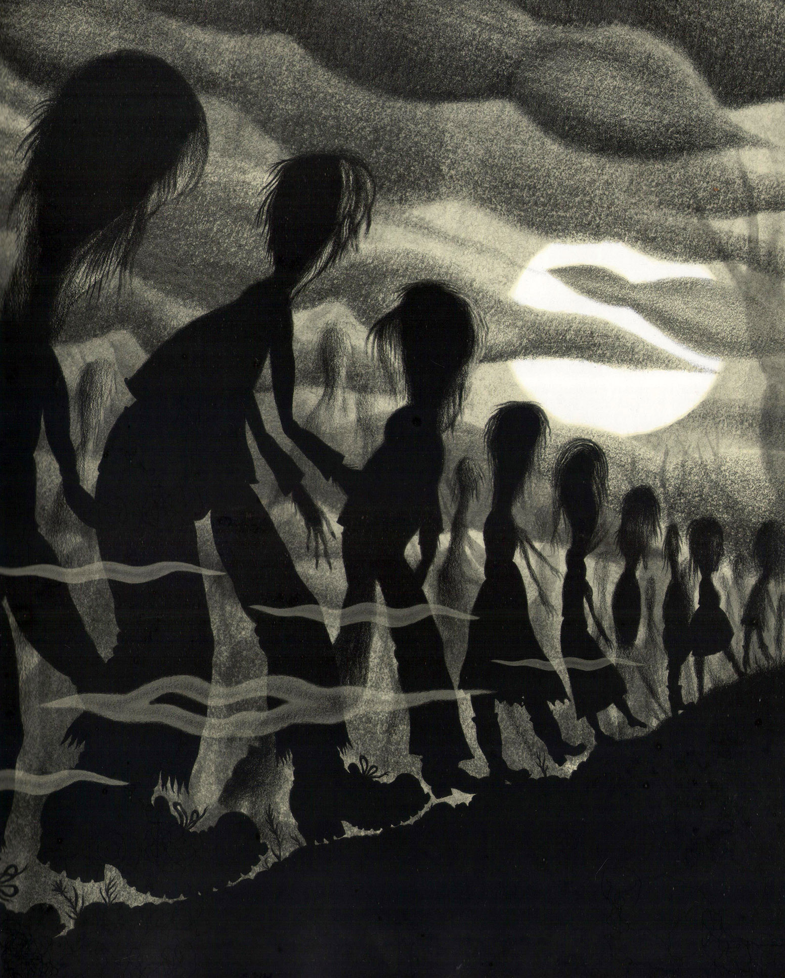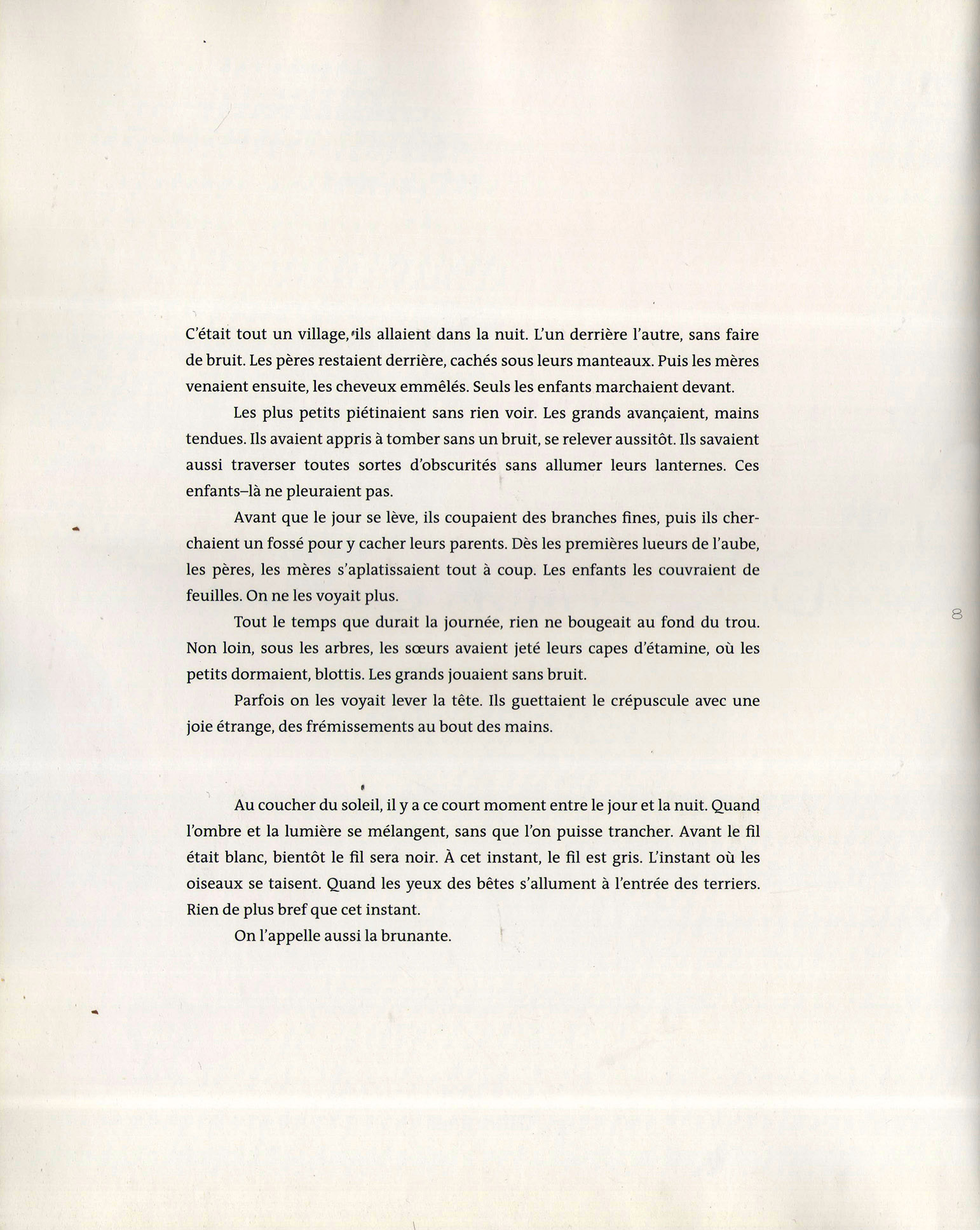 "C'était tout un village, ils allaient dans la nuit. L'un derrière l'autre, sans faire de bruit ; Les pères restaient derrière, cachés sous leurs manteaux. Puis les mères venaient ensuite, les chevaux emmêlés. Seuls les enfants marchaient devant."Dans ce conte, des parents qui ont commis des atrocités sont devenus des "bêtes d'ombre" ayant perdu la mémoire des mots. Seuls, l'amour et le pardon des enfants innocents pour ces parents leur permettra de devenir à nouveau des hommes. Ce conte est inspiré par le génocide qui a eu lieu au Rwanda du 6 avril au 4 juillet 1994.