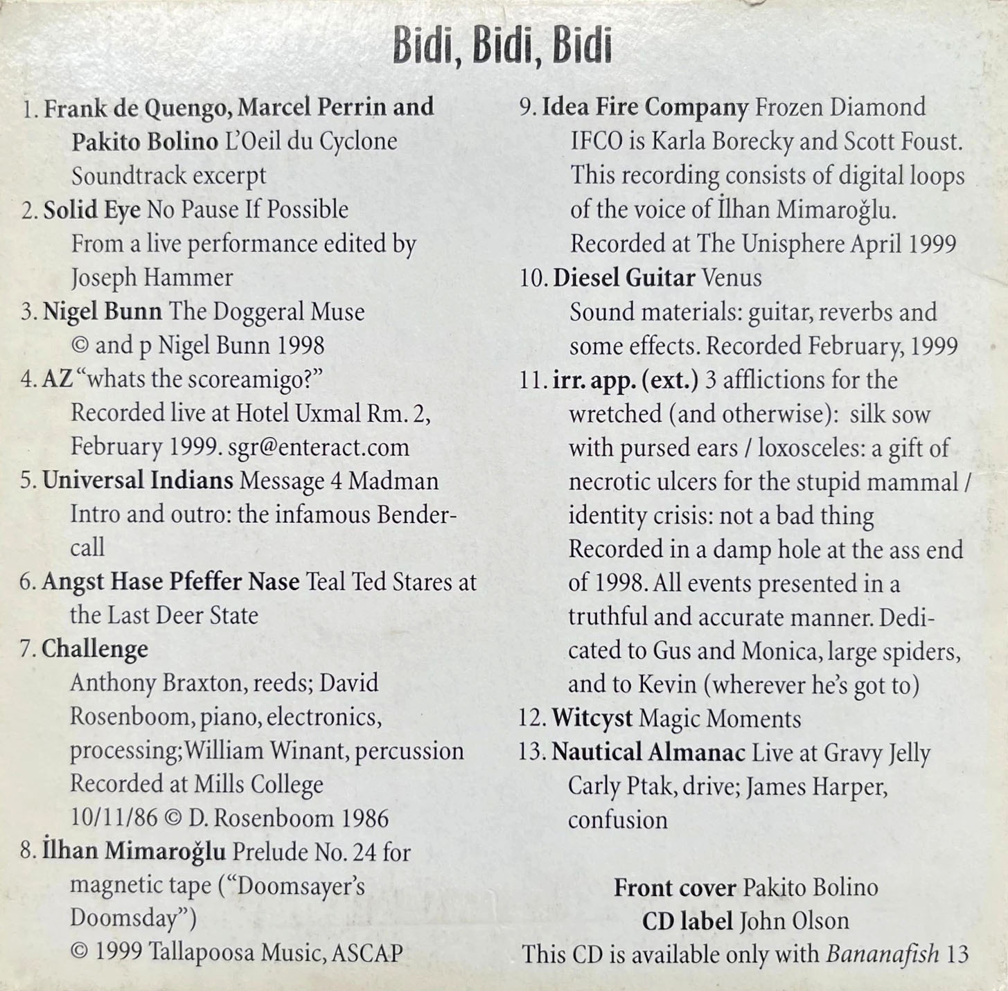 12.5 x 12.5 cm 2 pages → Offset ↪ US Parution en 1999Bidi, Bidi, Bidi par : Bolino (Pakito) Numerisation : Non CD - Tedium House Publications En recherche PLUS MOINS
