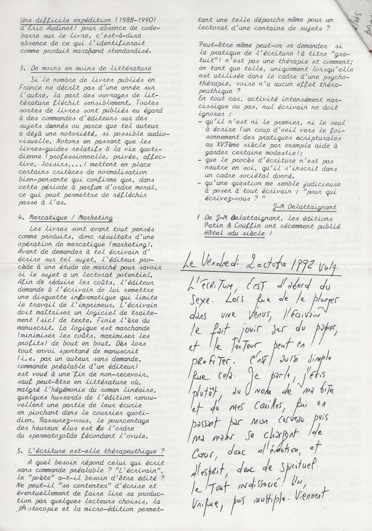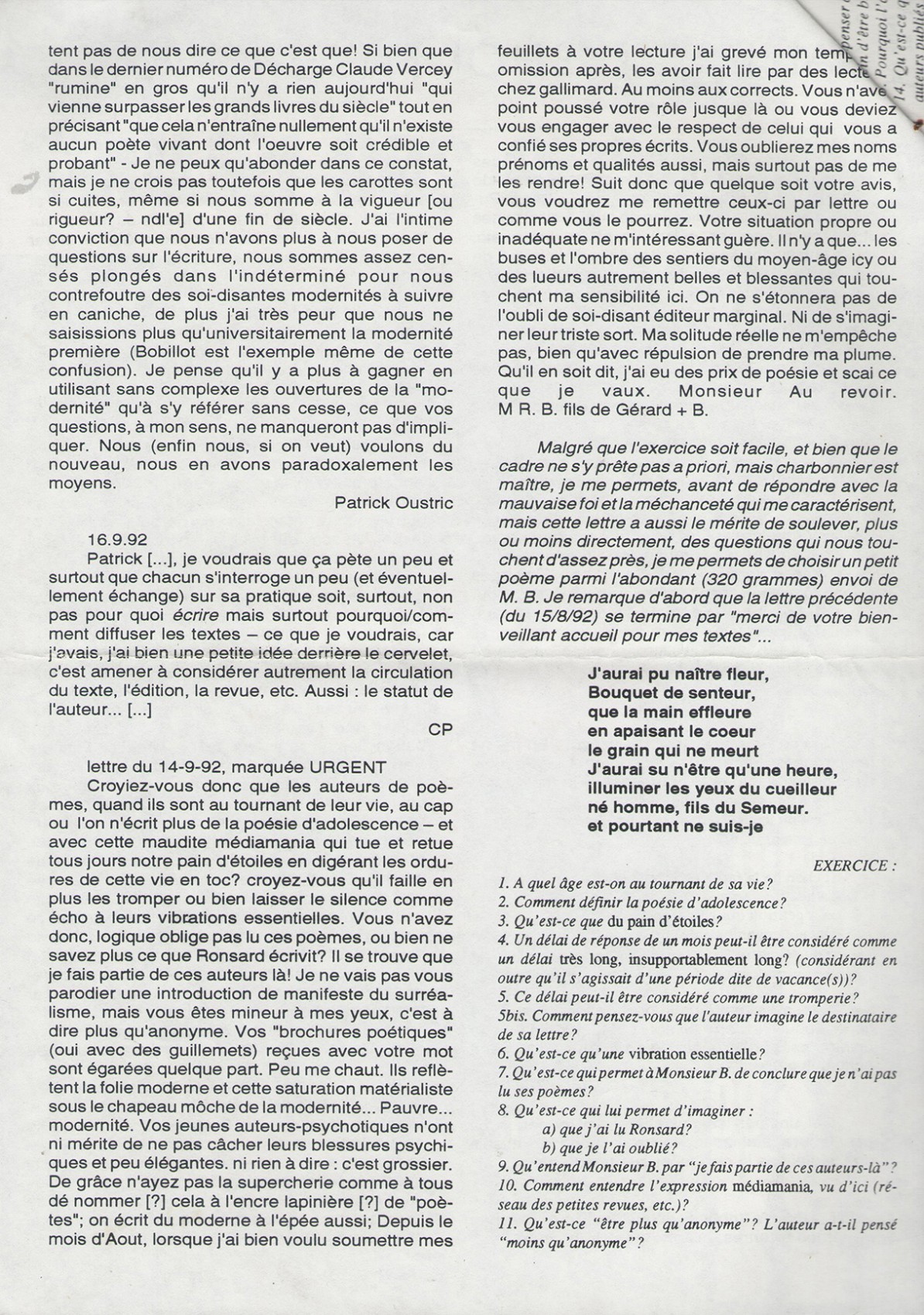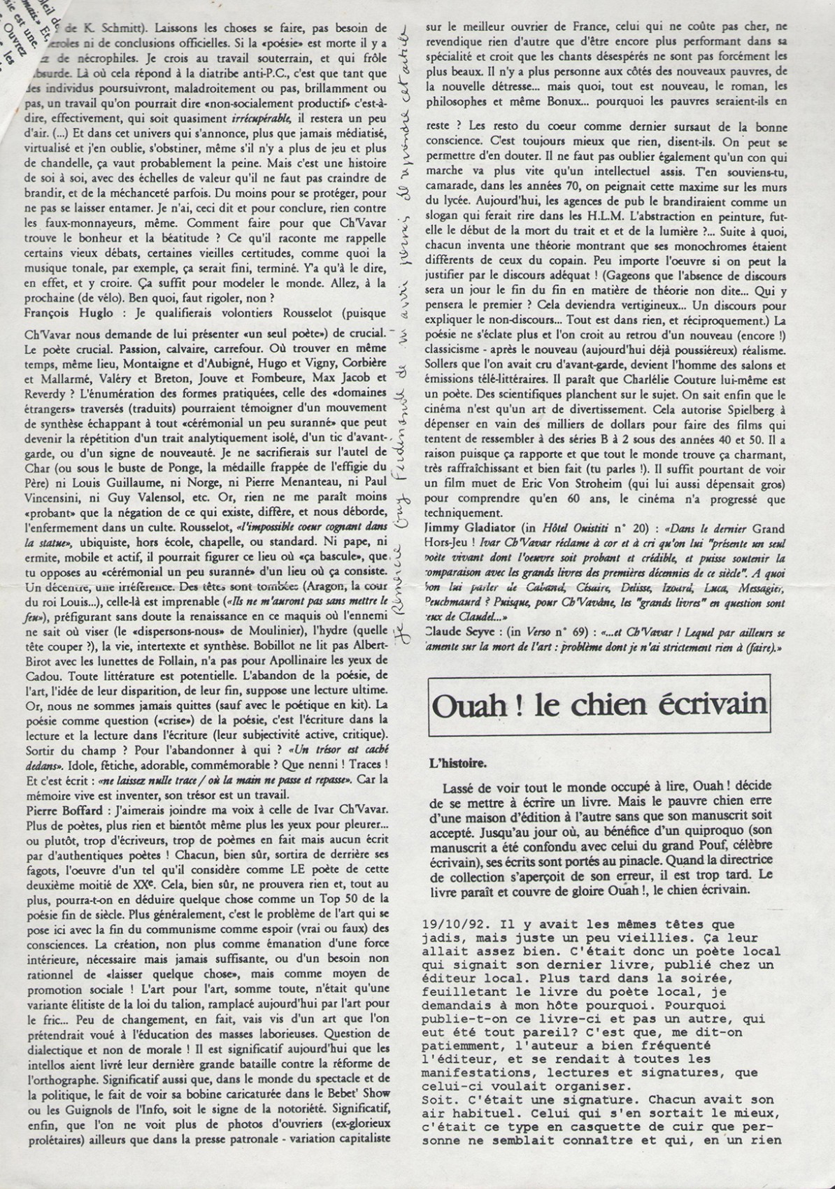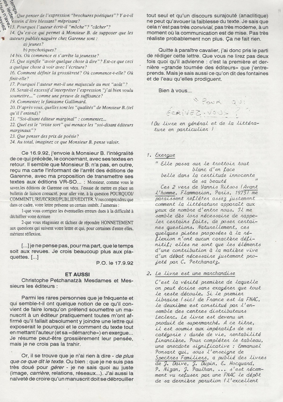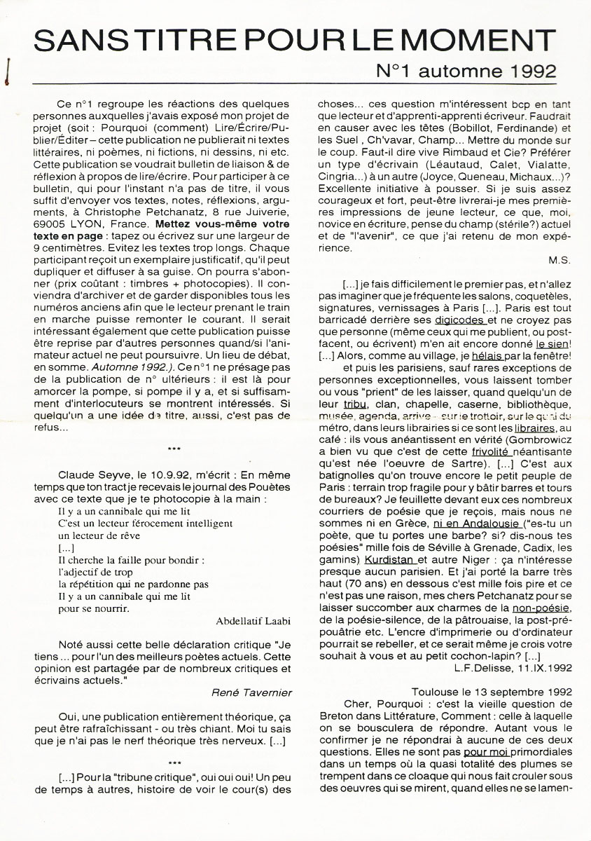 A4 8 pages → Photocopie NB ↪ FR ↪ 69 ↪ Lyon Parution en octobre 1992Sans Titre Pour Le Moment n°1 par : Petchanatz (Christophe) Auto édition Numerisation : Oui (300 dpi) Collection privée PLUS MOINS
