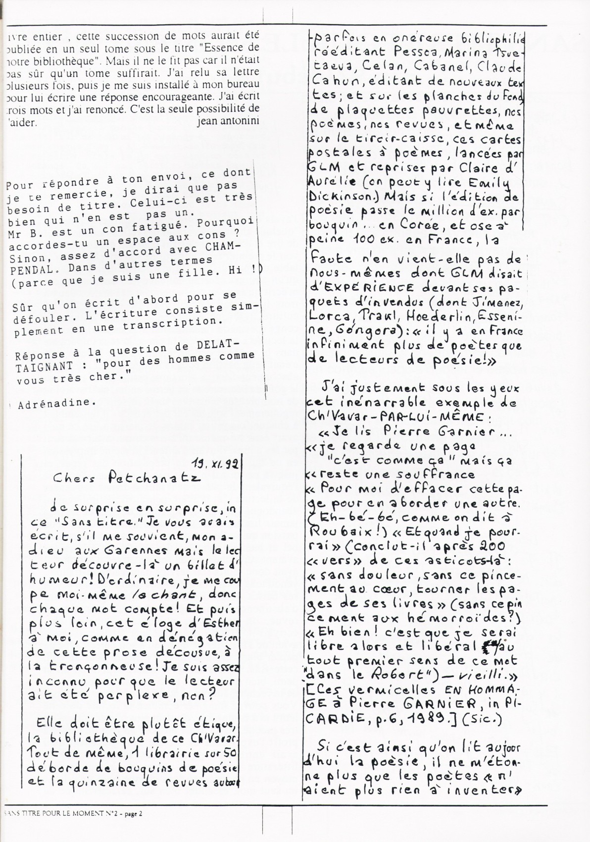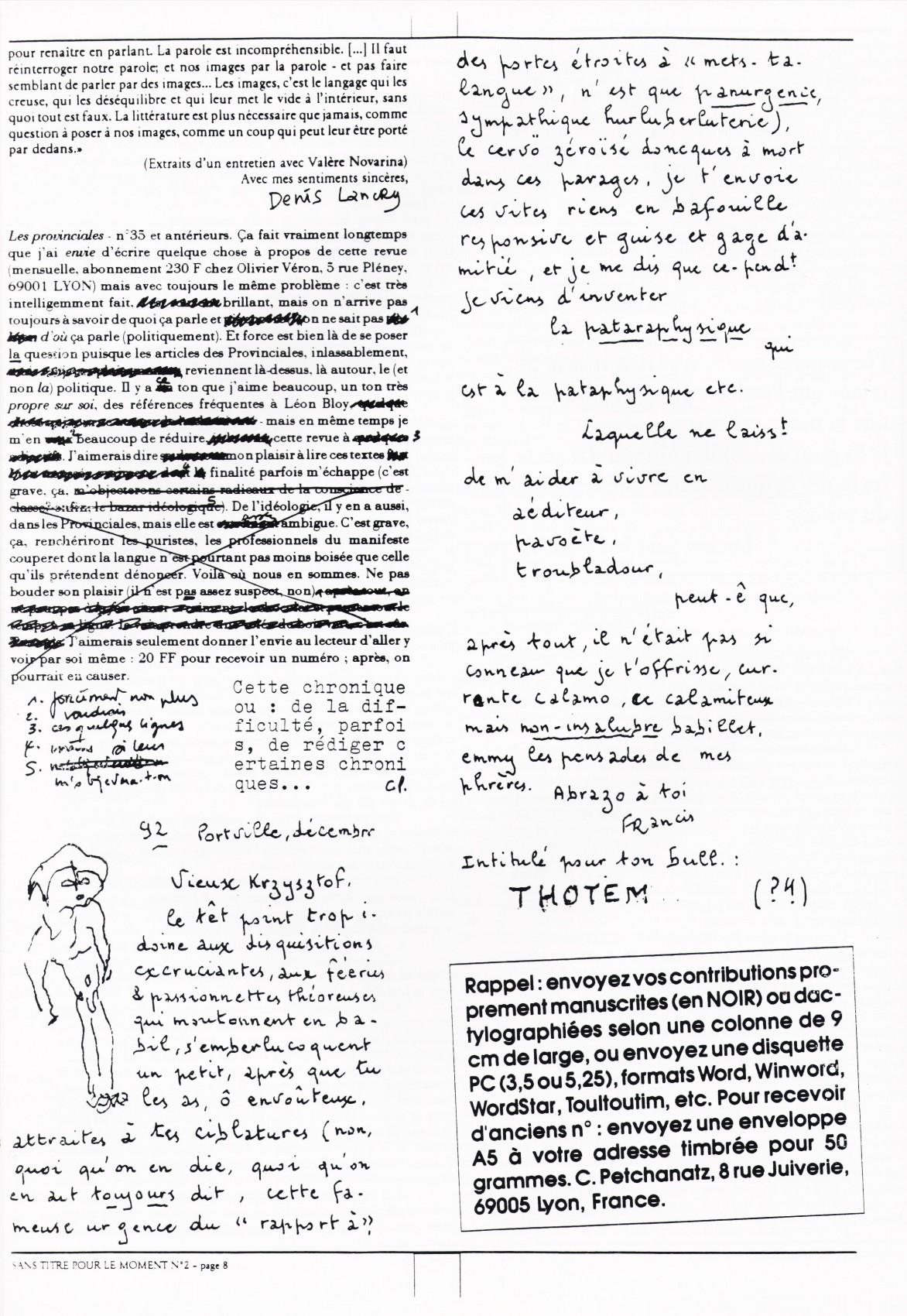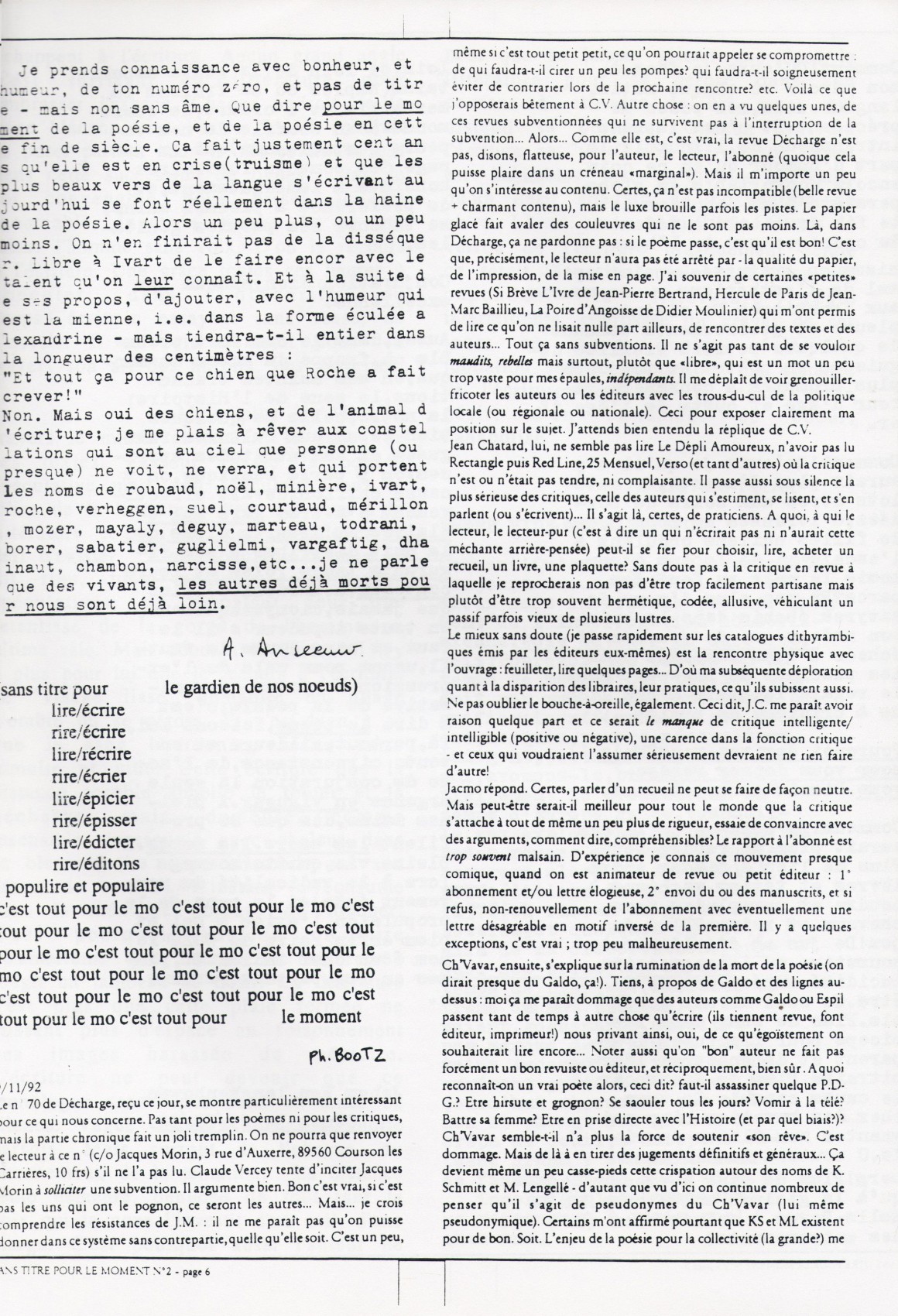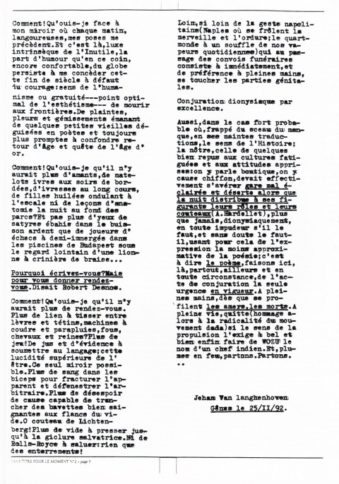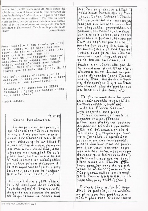 A4 8 pages → Photocopie NB ↪ FR ↪ 69 ↪ Lyon Parution en decembre 1992Sans Titre Pour Le Moment n°2 par : Petchanatz (Christophe) Numerisation : Oui (150 dpi) Collection privée PLUS MOINS
