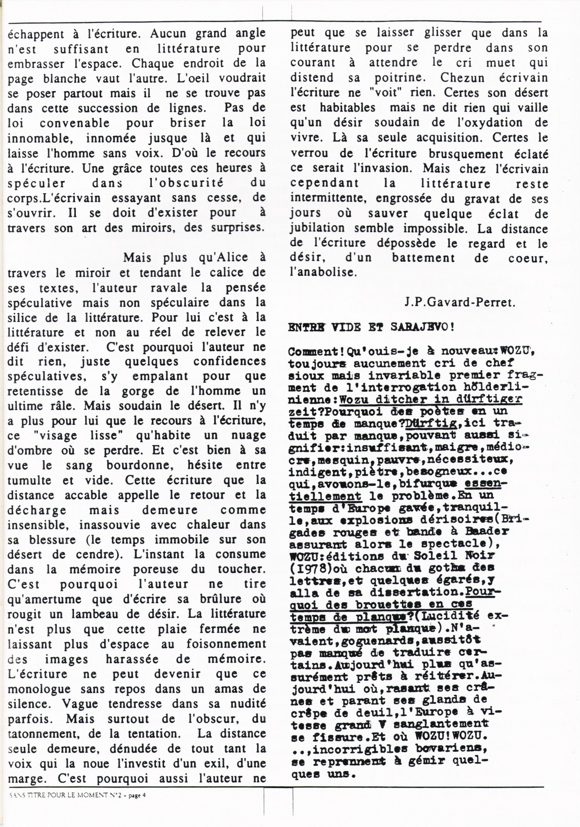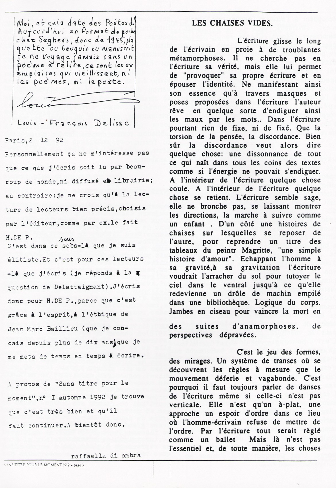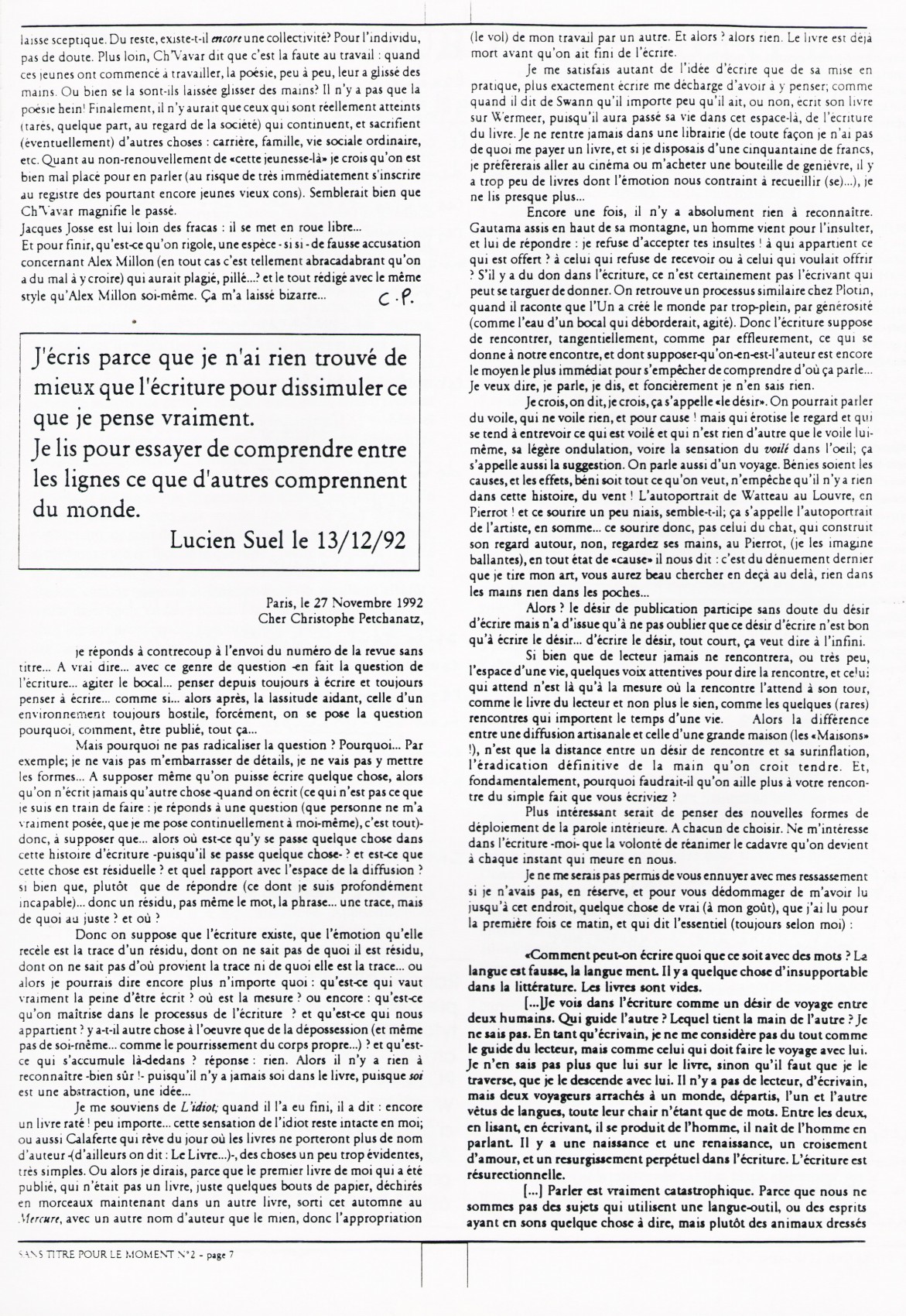 A4 8 pages → Photocopie NB ↪ FR ↪ 69 ↪ Lyon Parution en decembre 1992Sans Titre Pour Le Moment n°2 par : Petchanatz (Christophe) Numerisation : Oui (150 dpi) Collection privée PLUS MOINS
