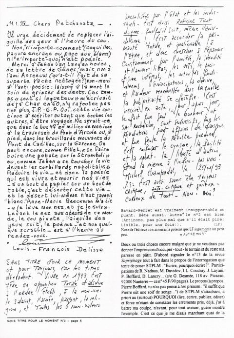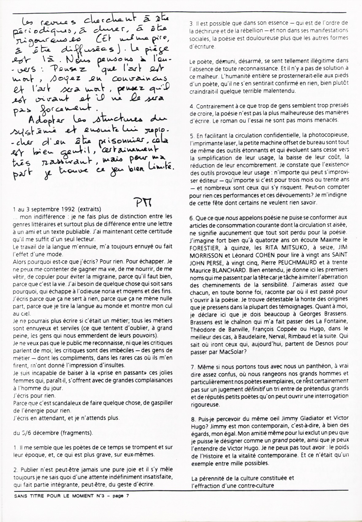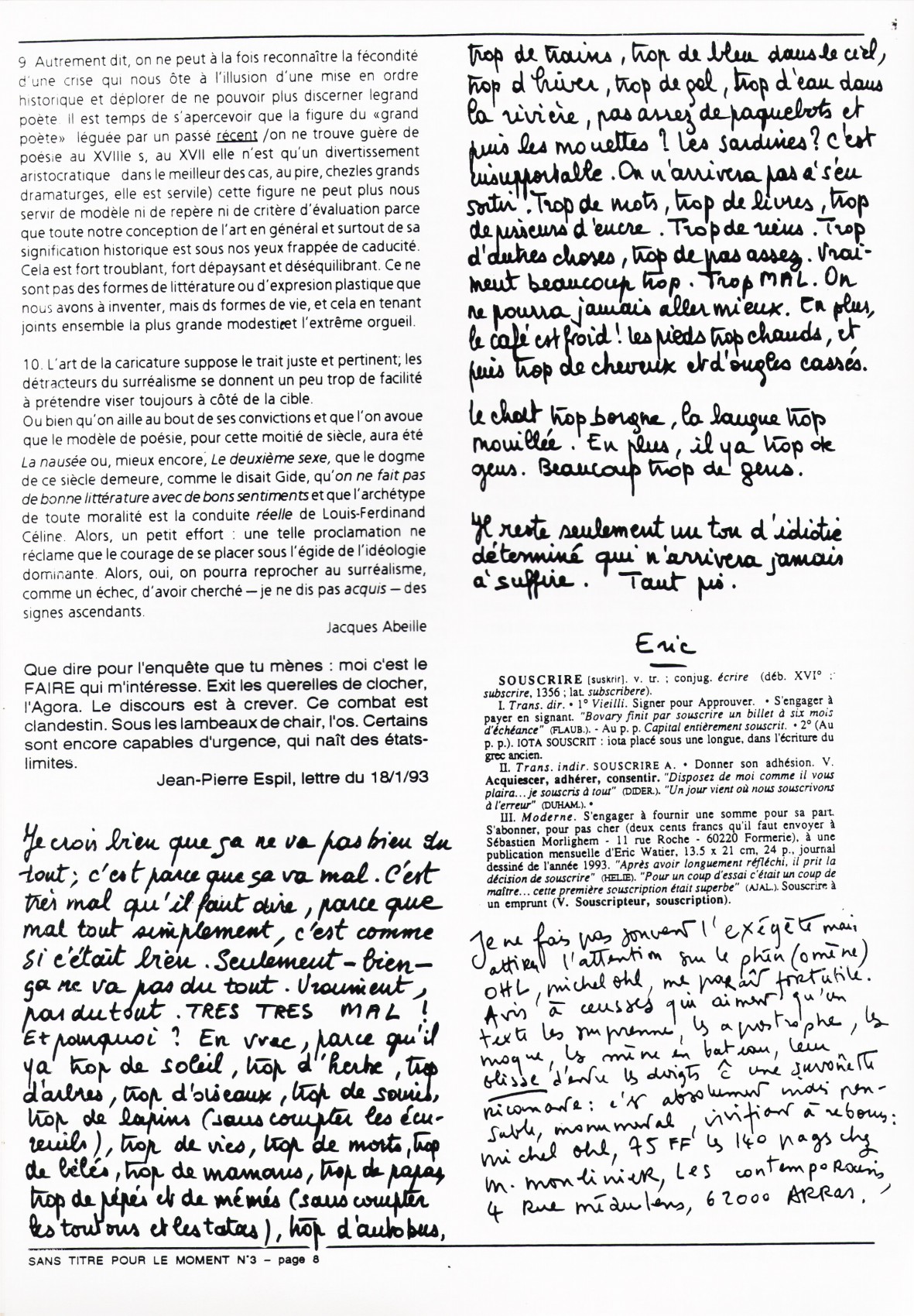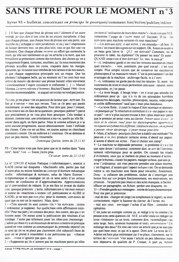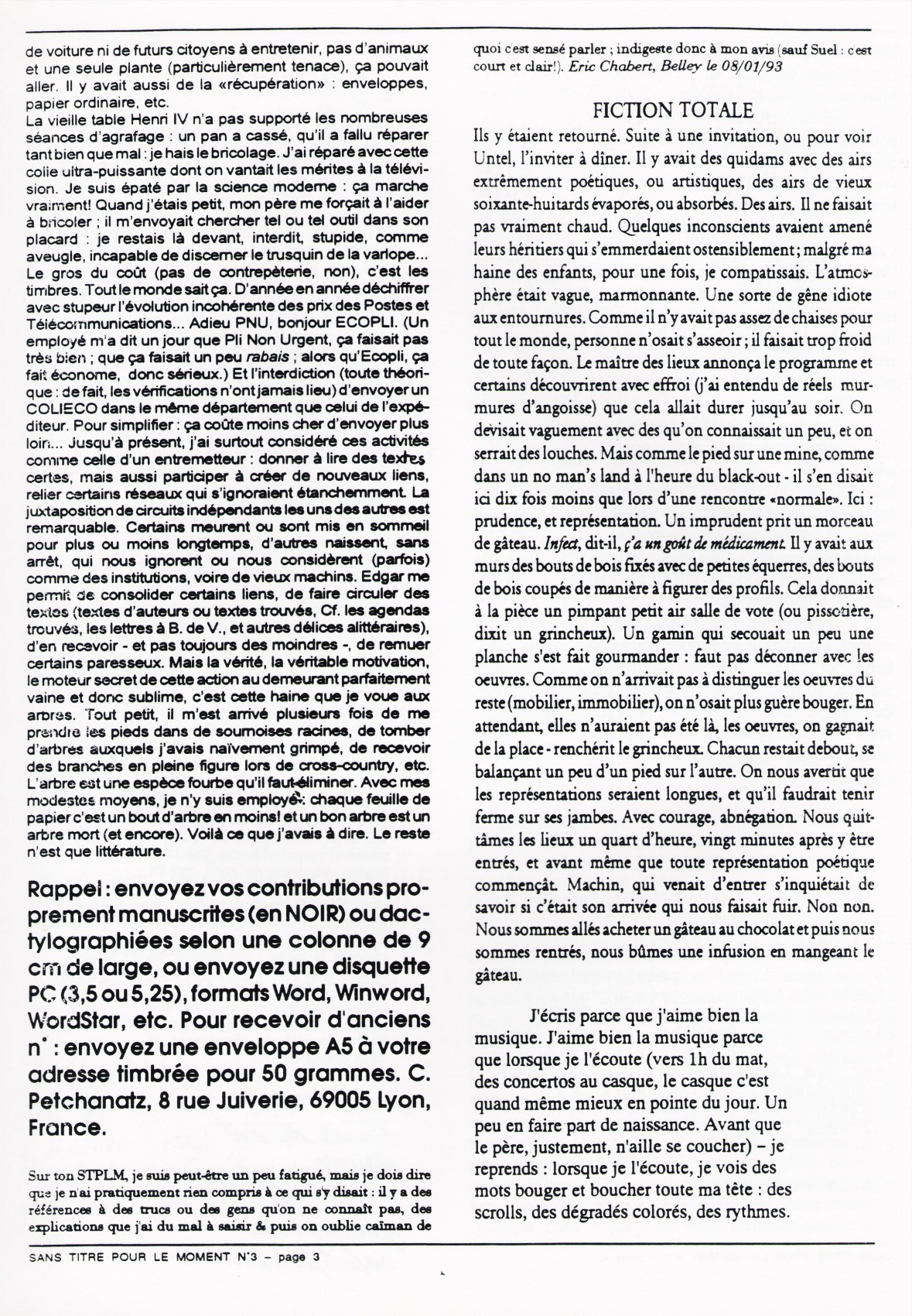 A4 8 pages → Photocopie NB ↪ FR ↪ 69 ↪ Lyon Parution en janvier 1993Sans Titre Pour Le Moment n°3 par : Petchanatz (Christophe) Numerisation : Oui (150 dpi) Collection privée PLUS MOINS
