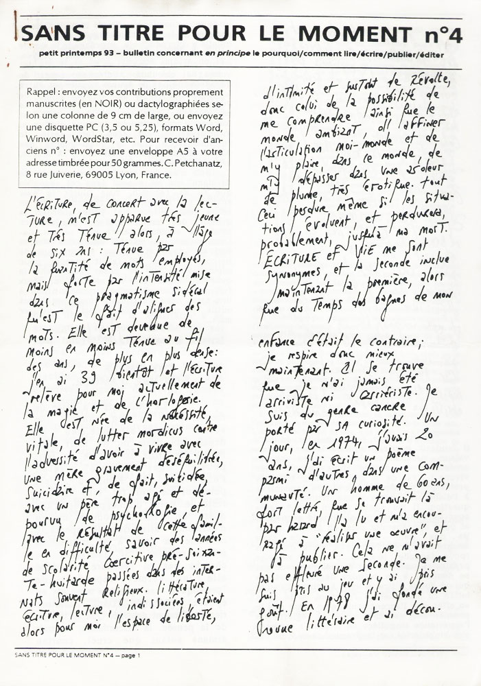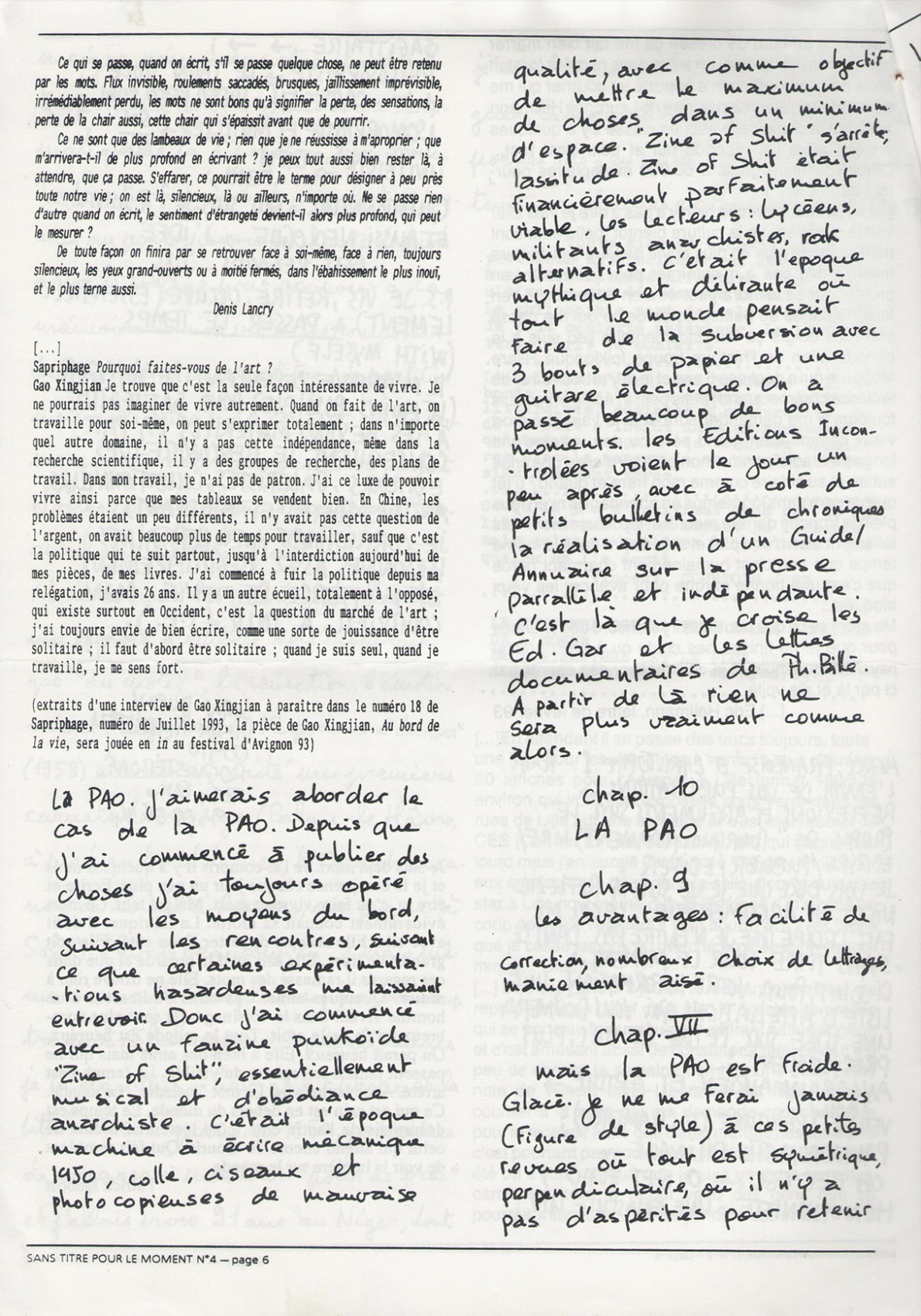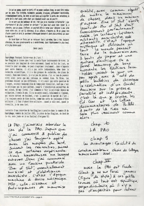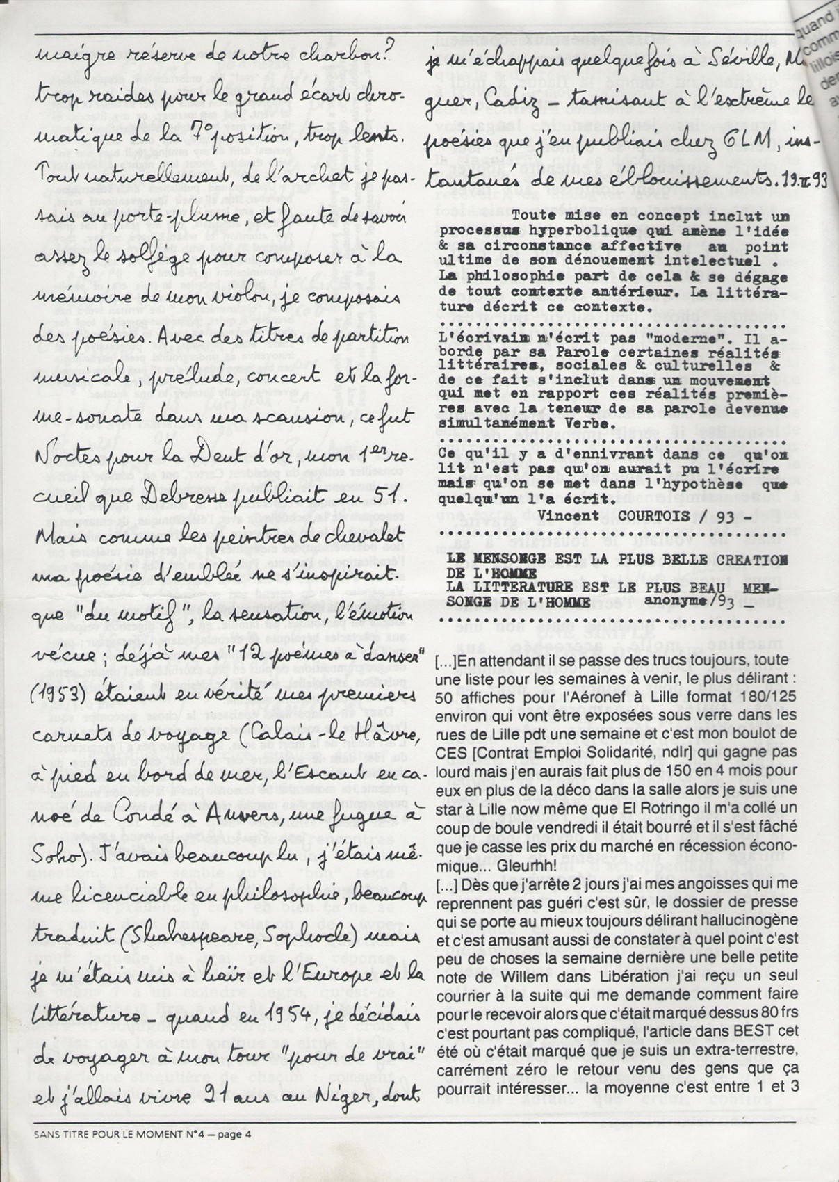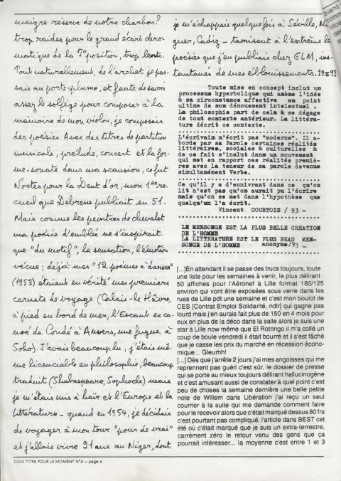 A4 12 pages → Photocopie NB ↪ FR ↪ 69 ↪ Lyon Parution en mars 1993Sans Titre Pour Le Moment n°4 par : Petchanatz (Christophe) Auto édition Numerisation : Oui (300 dpi) Collection privée PLUS MOINS