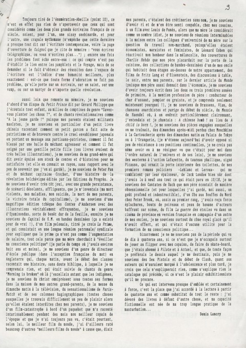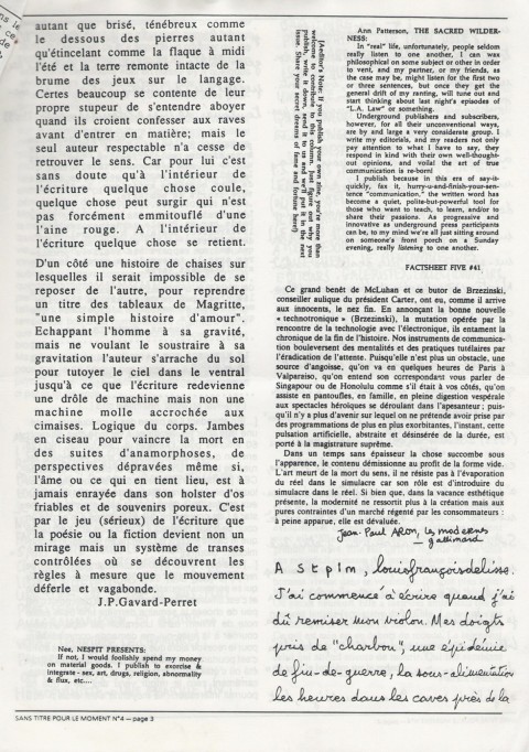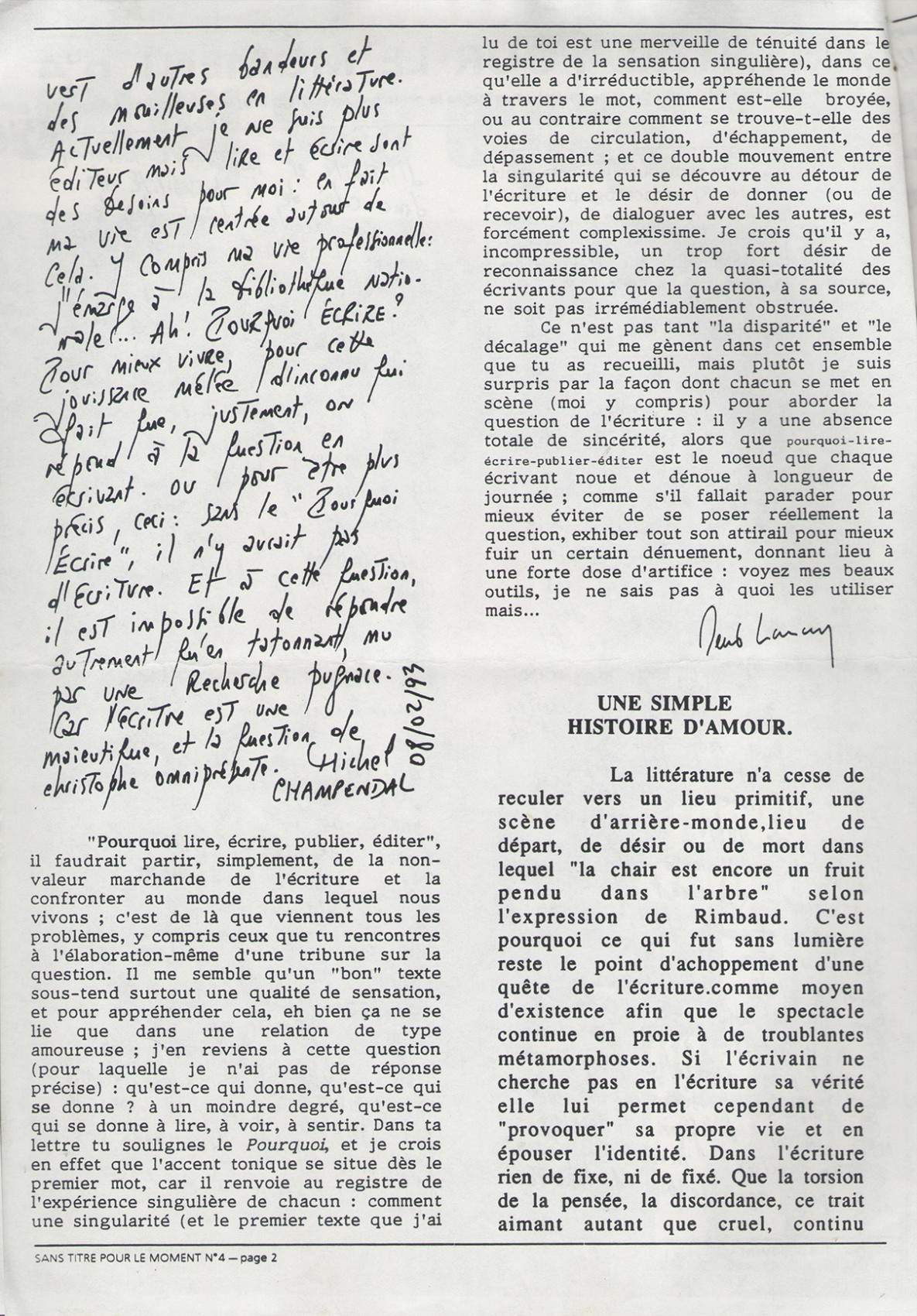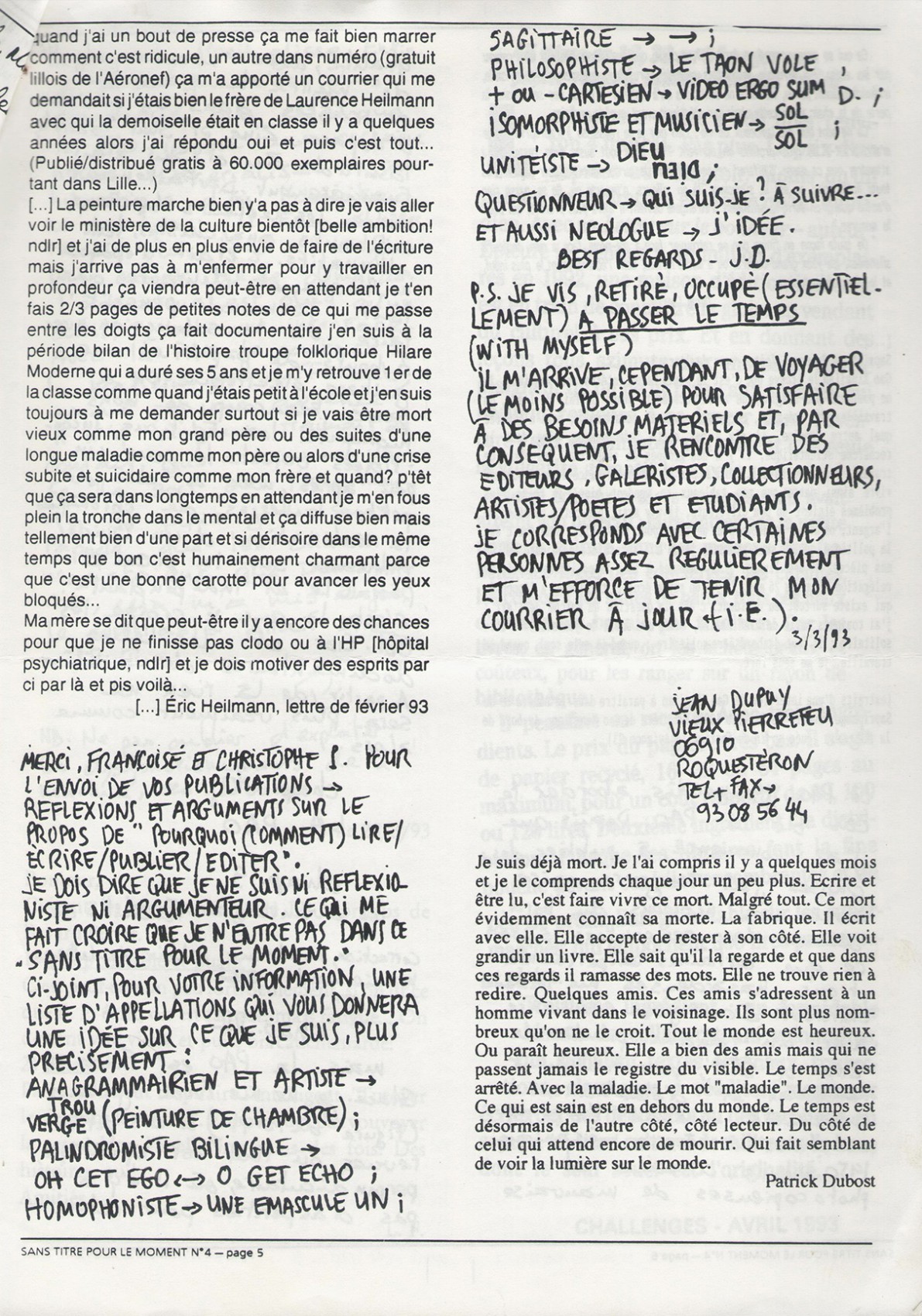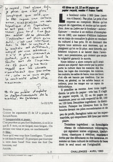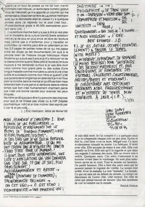 A4 12 pages → Photocopie NB ↪ FR ↪ 69 ↪ Lyon Parution en mars 1993Sans Titre Pour Le Moment n°4 par : Petchanatz (Christophe) Auto édition Numerisation : Oui (300 dpi) Collection privée PLUS MOINS