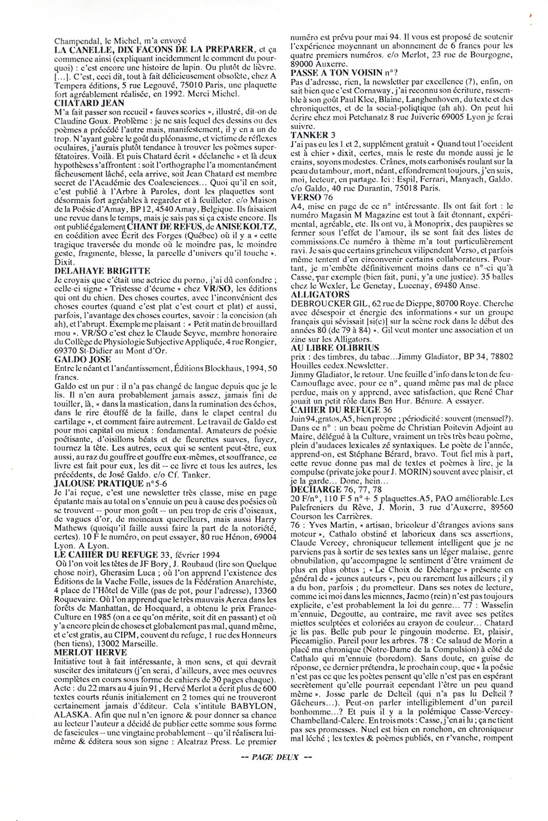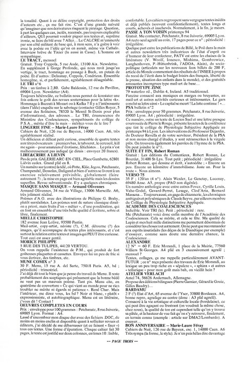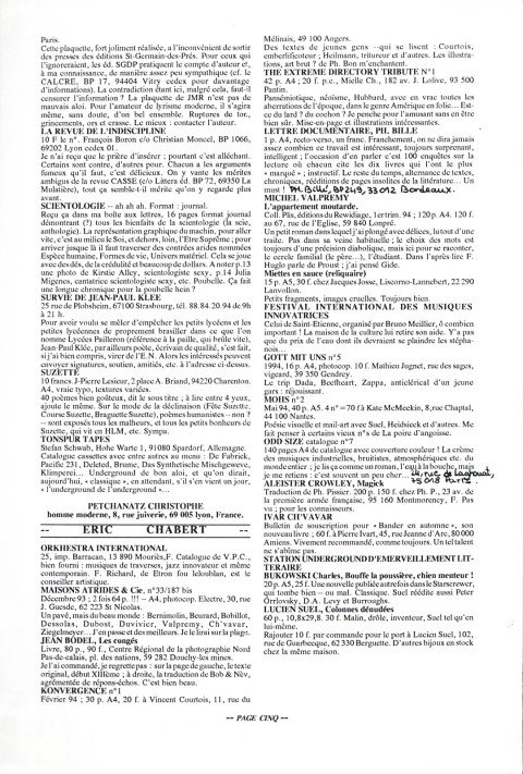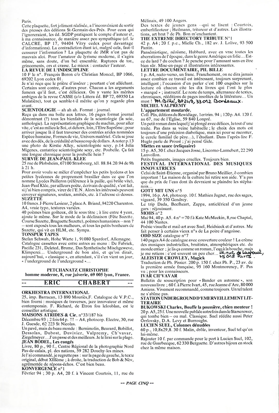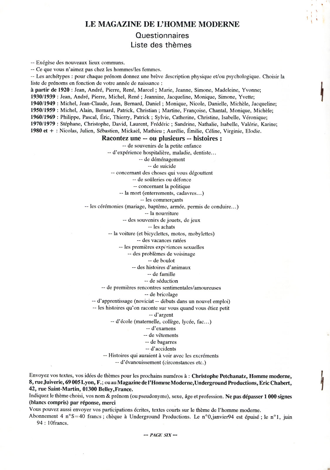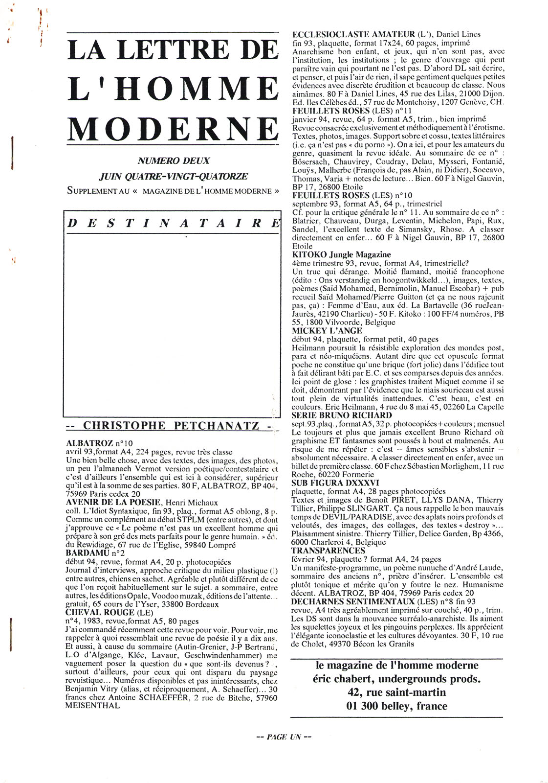 A4 6 pages → Photocopie NB ↪ FR ↪ 69 ↪ Lyon Parution en juin 1994La Lettre De l'Homme Moderne n°2 par : Petchanatz (Christophe) Auto édition Numerisation : Oui (300 dpi) Collection privée PLUS MOINS