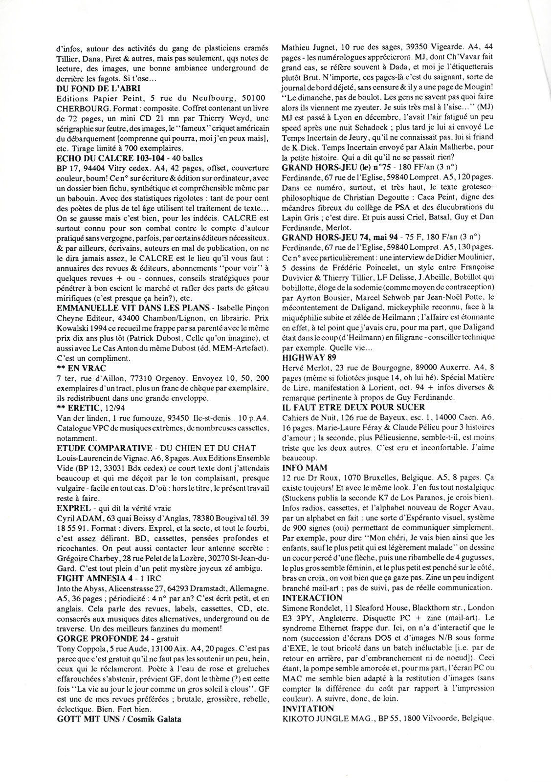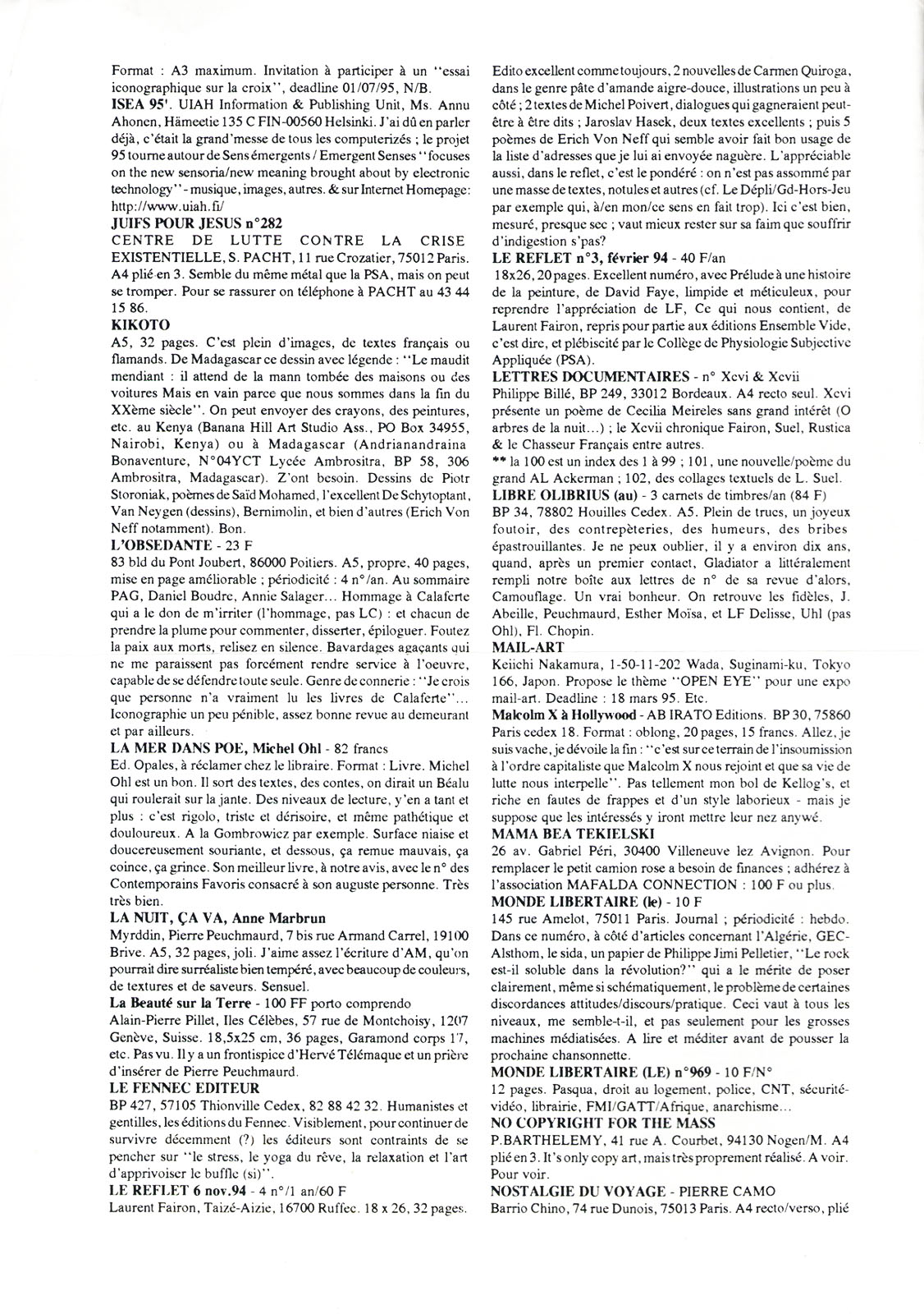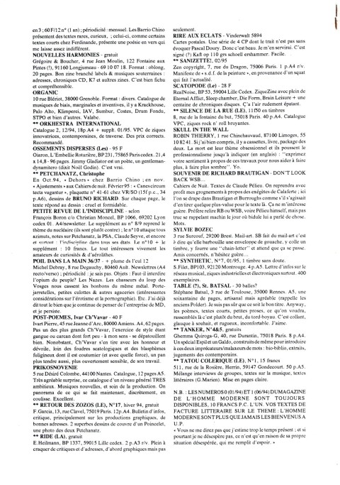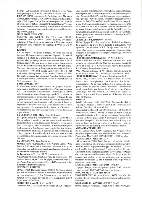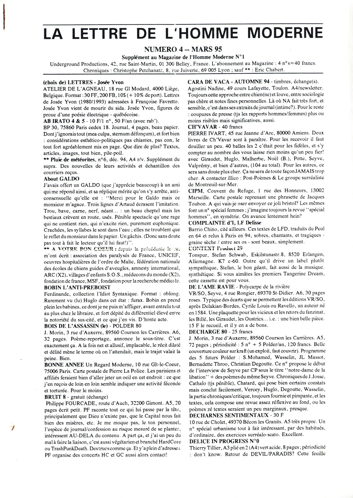 A4 4 pages → Photocopie NB ↪ FR ↪ 69 ↪ Lyon Parution en mars 1995La Lettre De l'Homme Moderne n°4 par : Petchanatz (Christophe) Auto édition Numerisation : Oui (300 dpi) Collection privée PLUS MOINS