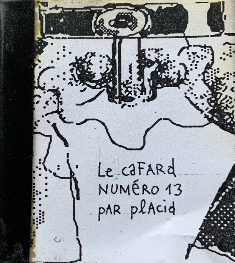 Carré 6 x 6 cm → Photocopie NB ↪ FR ↪ 66 ↪ Perpignan Parution en 1986Le Cafard n°13 par : Placid Numerisation : Non En recherche PLUS MOINS