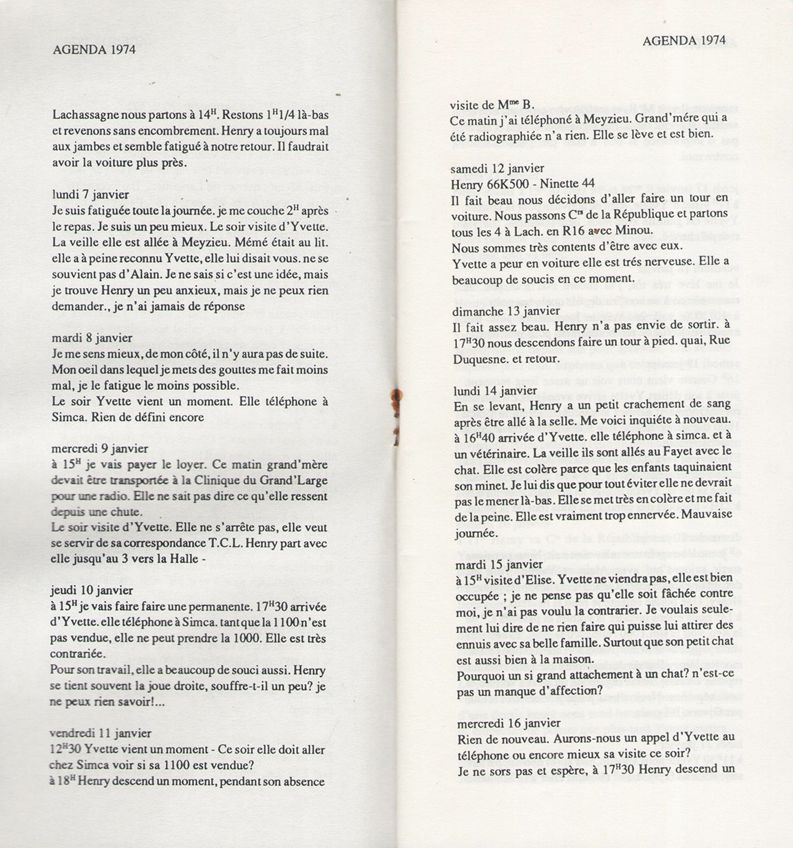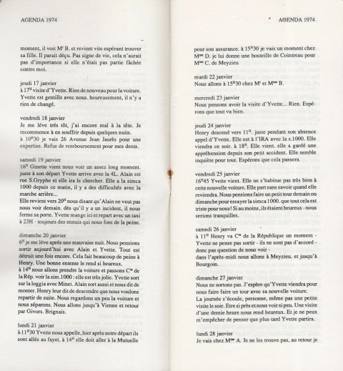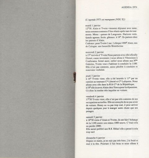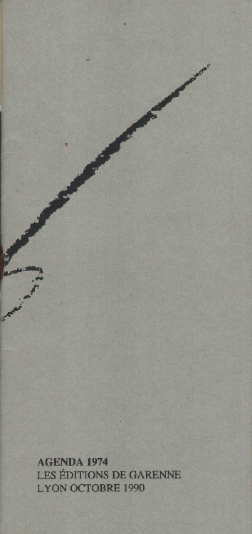 10 x 21 cm 52 pages → Photocopie NB ↪ FR ↪ 69 ↪ Lyon Parution en octobre 1990Agenda 1974 chez : Editions De Garenne Numerisation : Oui (300 dpi) Collection privée PLUS MOINS