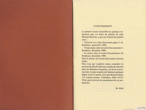 A5 16 pages → Photocopie NB ↪ FR ↪ 69 ↪ Lyon Parution en mars 1992Neuf Poèmes chez : Editions De Garenne Numerisation : Oui (300 dpi) Texte John M Bennett Collection privée PLUS MOINS