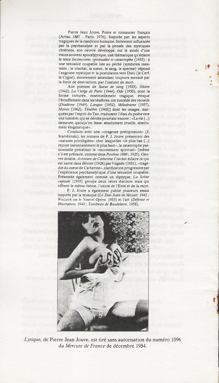 8 pages → Photocopie NB ↪ FR ↪ 59 ↪ Lompret Parution en 1990Lyrique chez : Rewidiage Numerisation : Oui (300 dpi) Par Pierre Jean Jouve - Collection privée PLUS MOINS