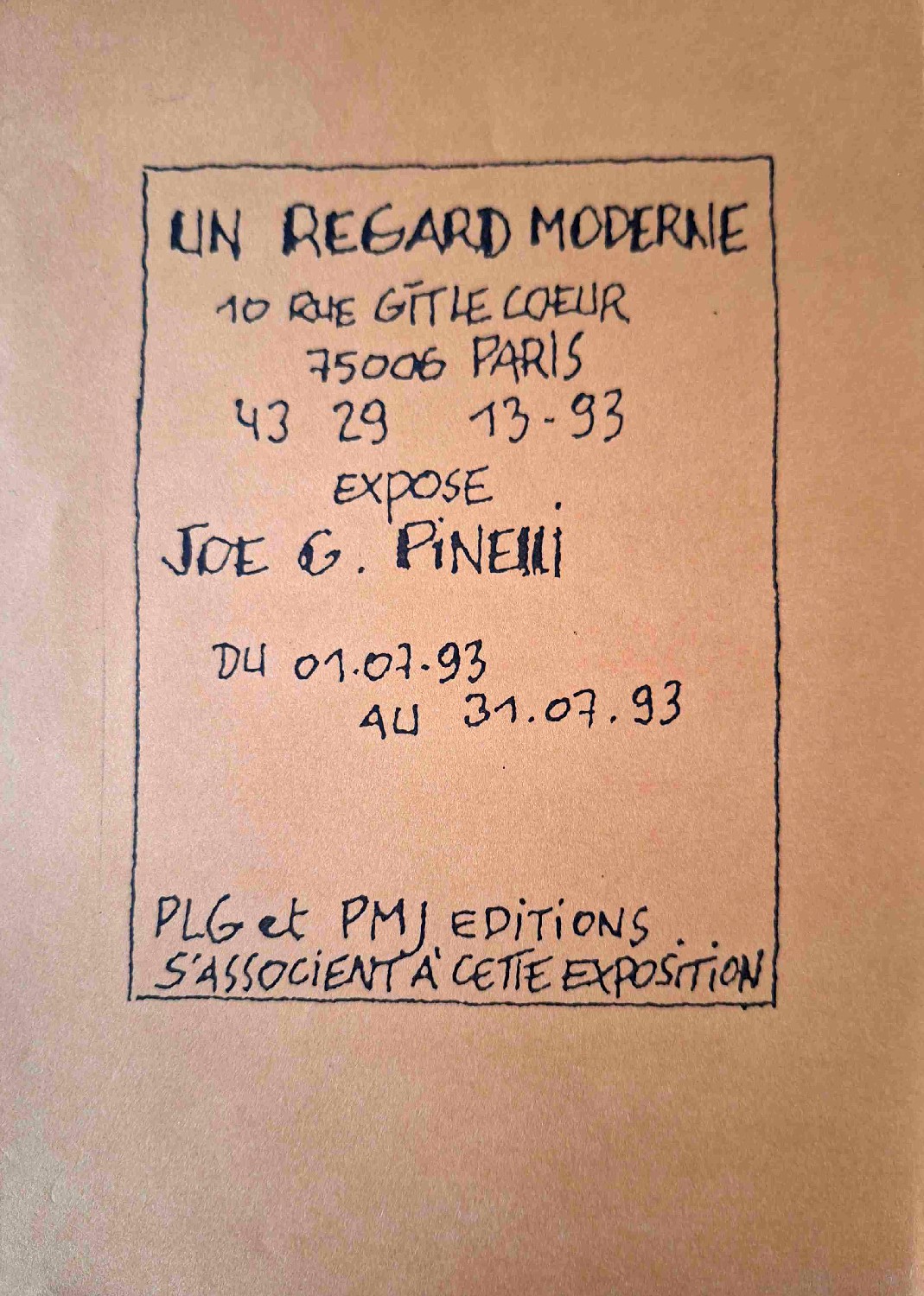 A5 1 pages → Photocopie NB ↪ FR ↪ Paris Parution en juillet 1993Joe G Pinelli par : Pinelli (Joe G) chez : Un Regard Moderne Numerisation : Oui (150 dpi) Du 1° au 31 juillet - Collection privée PLUS MOINS
