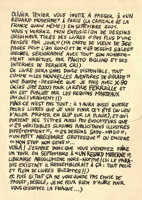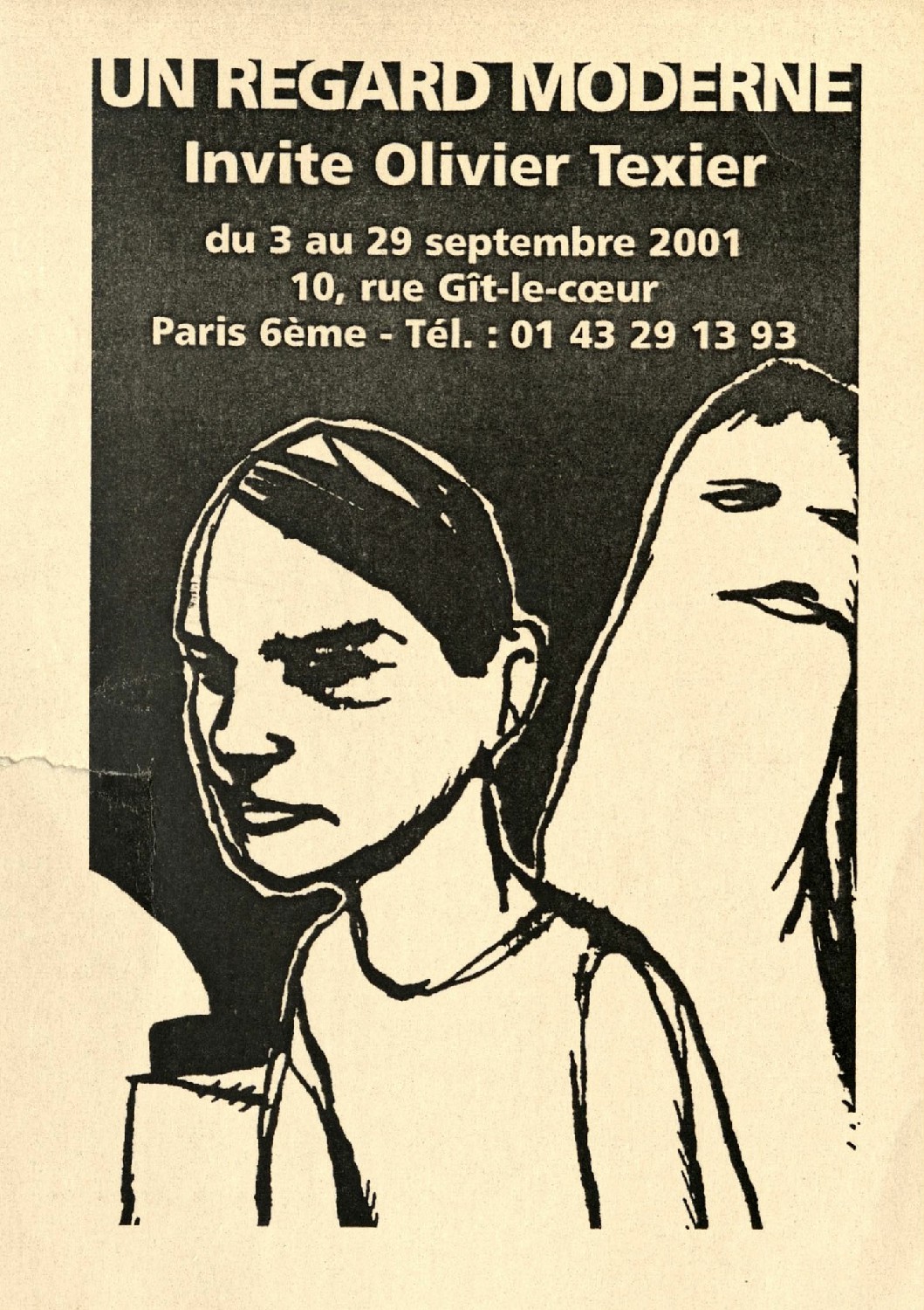 A6 2 pages → Photocopie NB ↪ FR ↪ Paris Parution en septembre 2001Olivier Texier chez : Un Regard Moderne Numerisation : Oui (150 dpi) Du 3 au 29 septembre - Collection privée PLUS MOINS