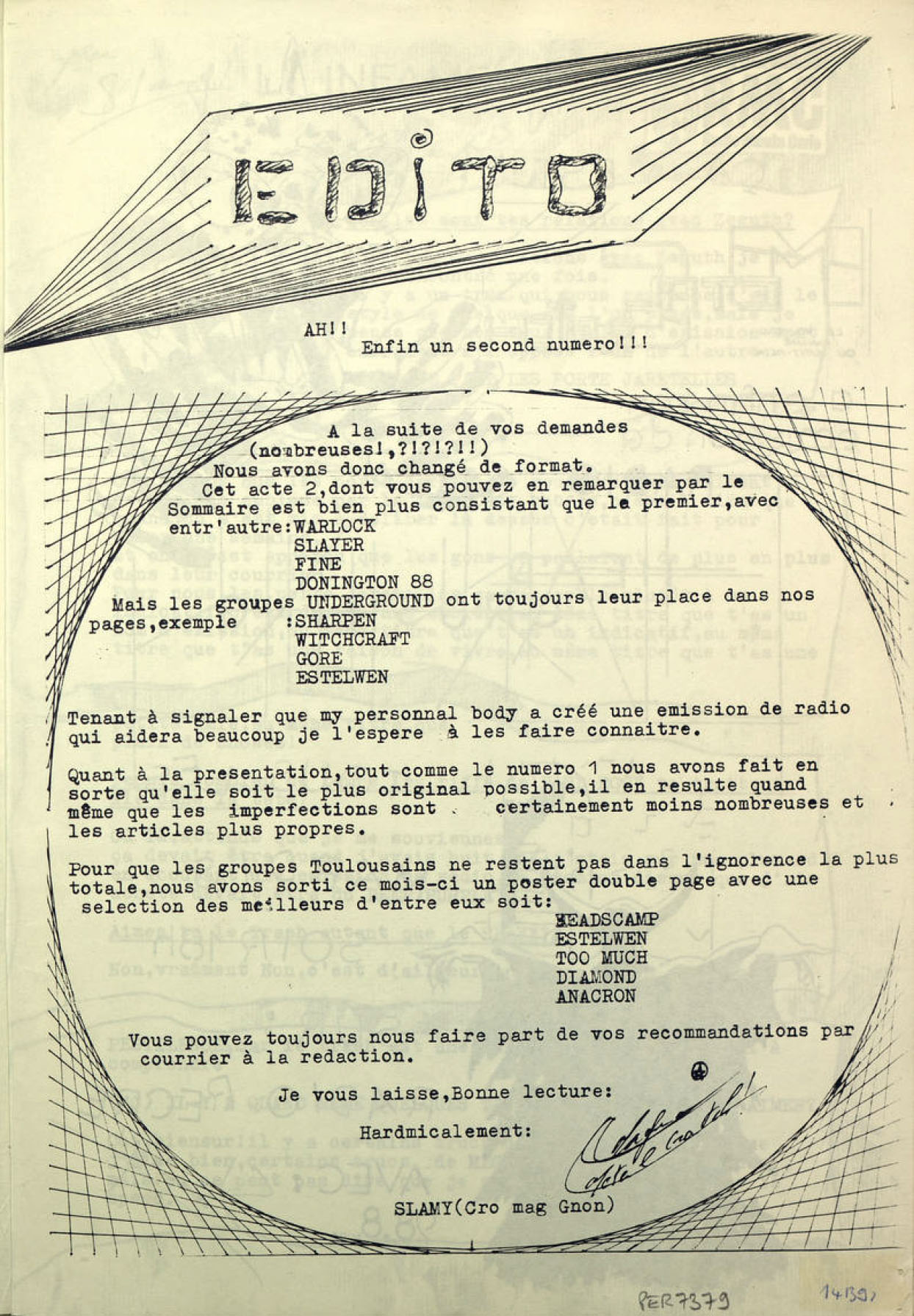 A4 64 pages → Photocopie NB ↪ FR ↪ 82 ↪ Montauban Parution en septembre 1988Metal Cratch n°2 Numerisation : Oui (150 dpi) En ligne sur Fanzinothèque.fr PLUS MOINS