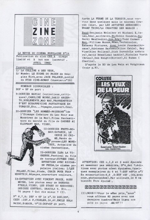 A4 74 pages → Offset ↪ FR ↪ 94 ↪ Saint Maur des Fossés Parution en avril 1982Ciné Zine Zone n°14 Numerisation : Oui (300 dpi) Collection Fanzinothèque de Poitiers PLUS MOINS