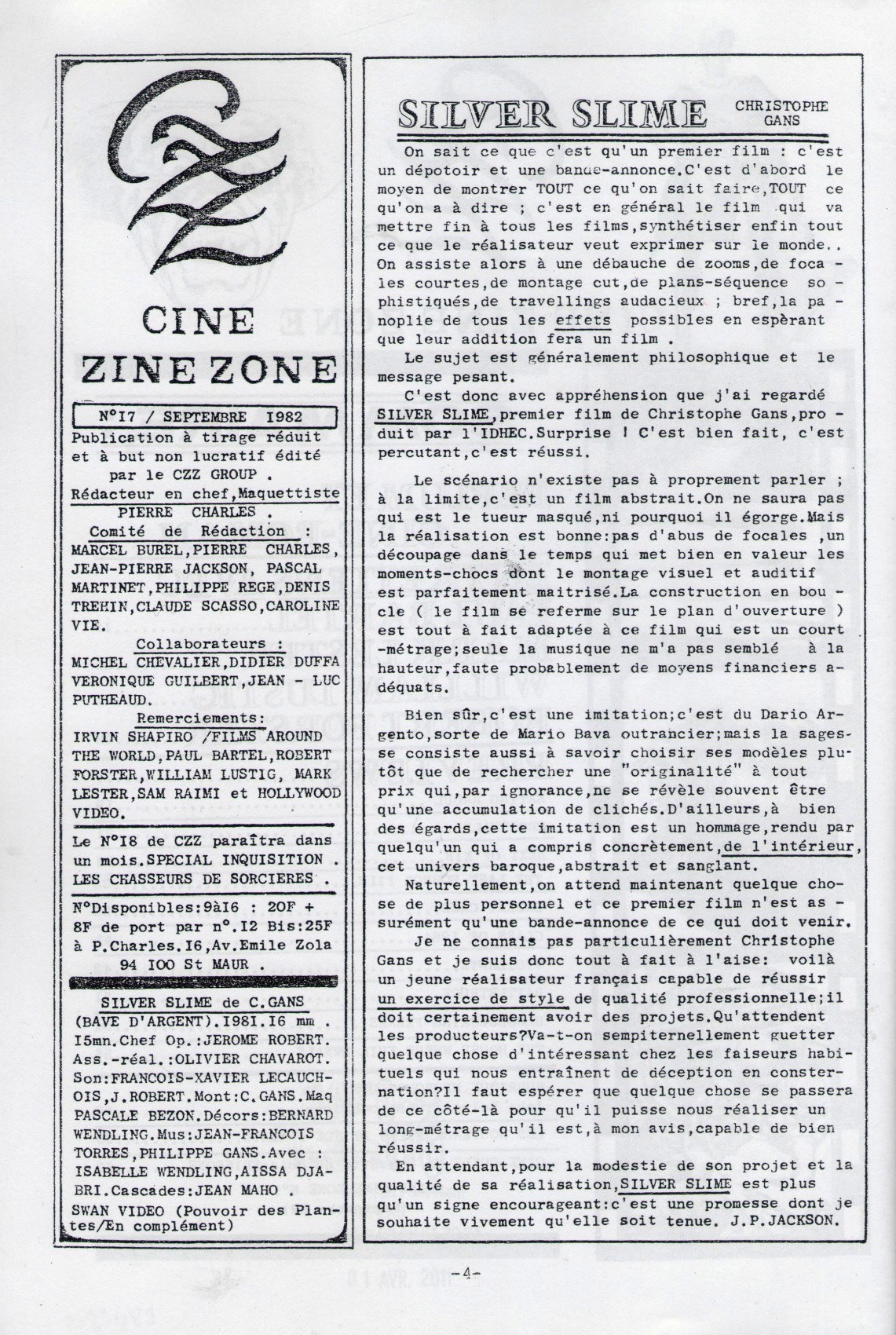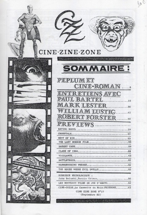 A4 70 pages → Offset ↪ FR ↪ 94 ↪ Saint Maur des Fossés Parution en septembre 1982Ciné Zine Zone n°17 - Frissons Frisson Numerisation : Oui (300 dpi) Collection Fanzinothèque de Poitiers PLUS MOINS