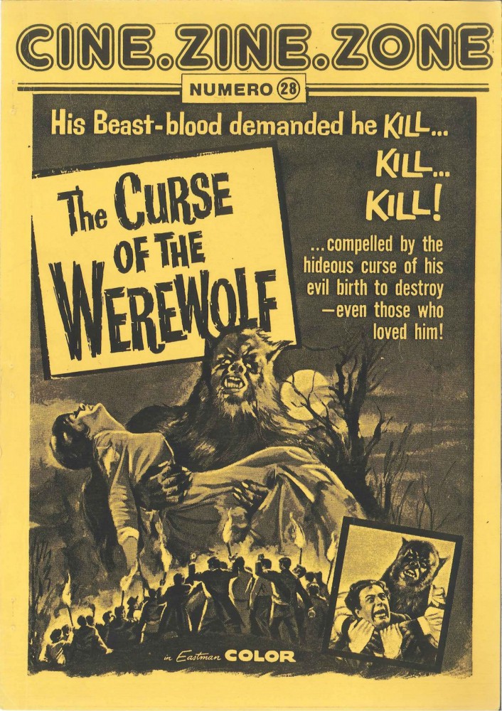 A4 76 pages → Offset ↪ FR ↪ 94 ↪ Saint Maur des Fossés Parution en 1986Ciné Zine Zone n°28 - Curse Of The Werewolf Numerisation : Oui En ligne sur Le Fanzinophile PLUS MOINS