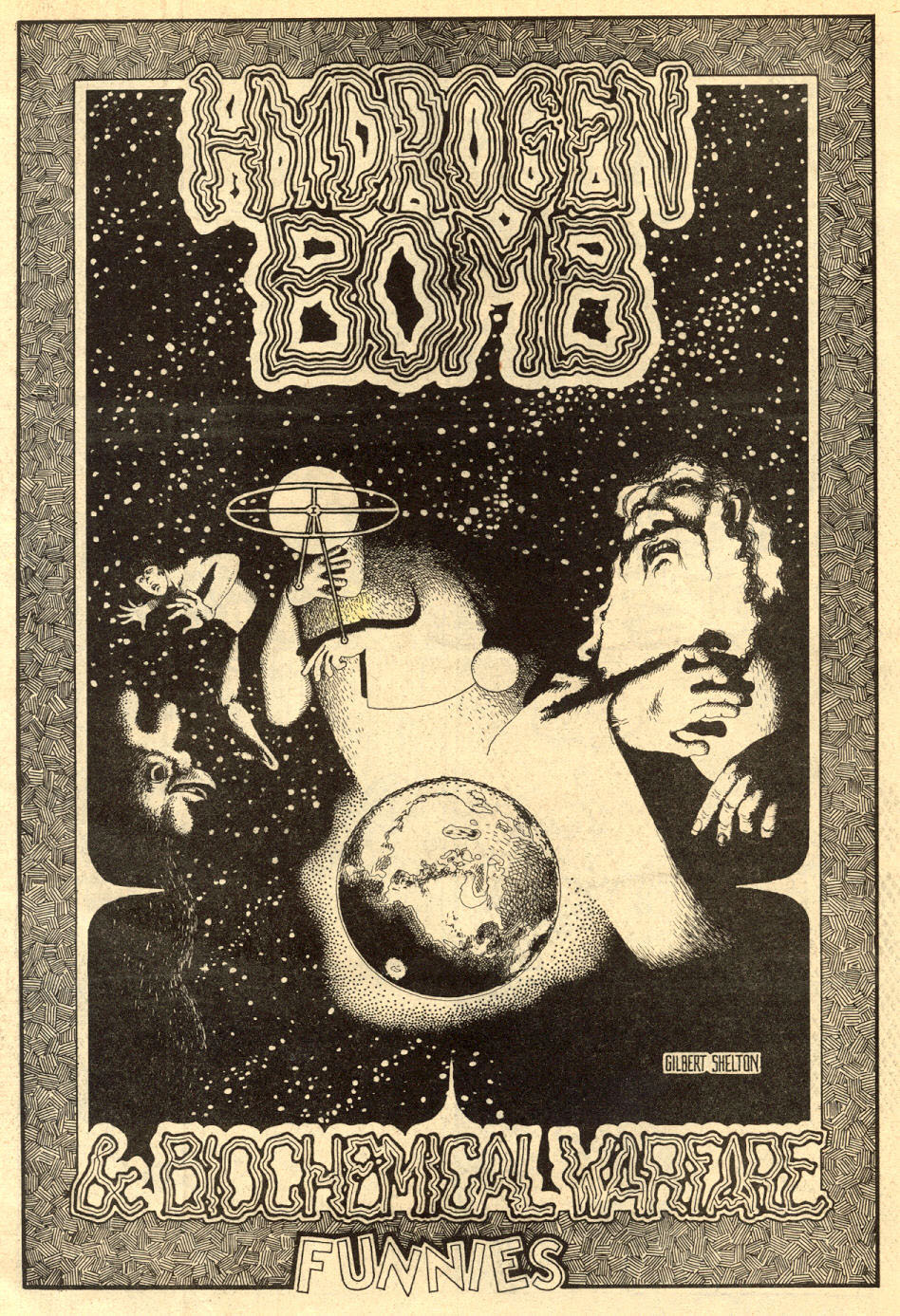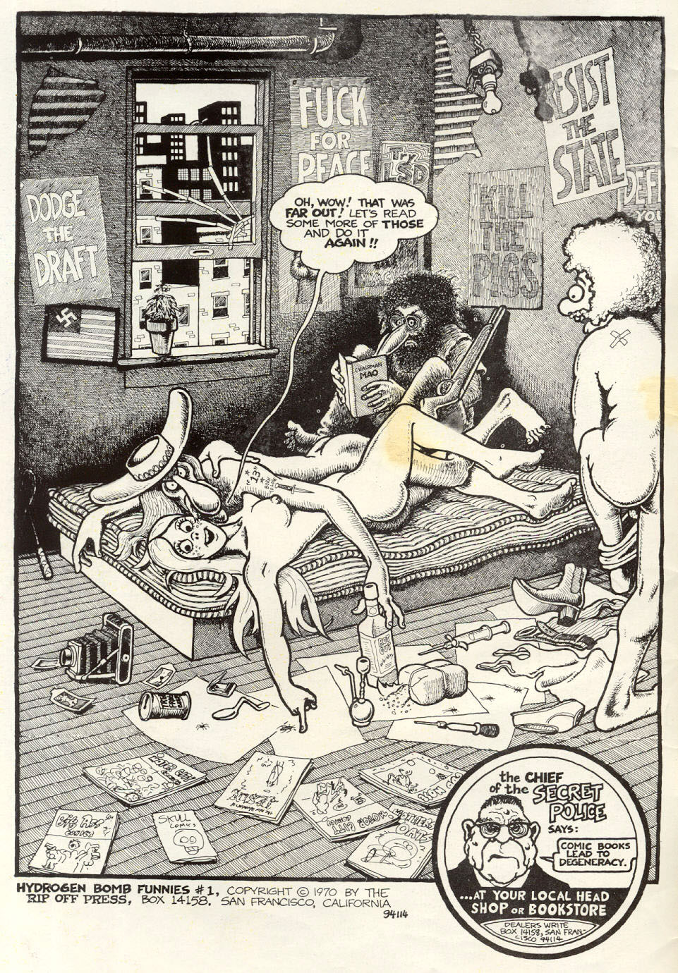 Comic 17 x 26 cm 60 pages → Offset ↪ US Parution en mai 1970Hydrogen Bomb Funnies Numerisation : Oui Edition Rip Off Press En ligne sur Read Comic Online PLUS MOINS