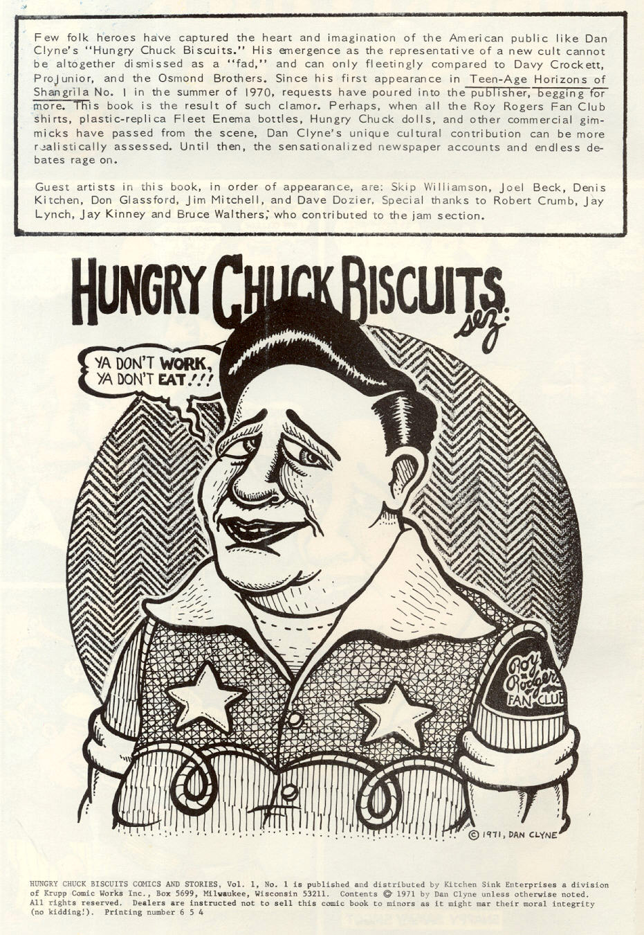 Comic 36 pages → Offset ↪ US ↪ Milwaukee Parution en 1971Hungry Chuck Biscuits n°1 Numerisation : Oui (150 dpi) Edition Kitchen Sink - Collection privée PLUS MOINS