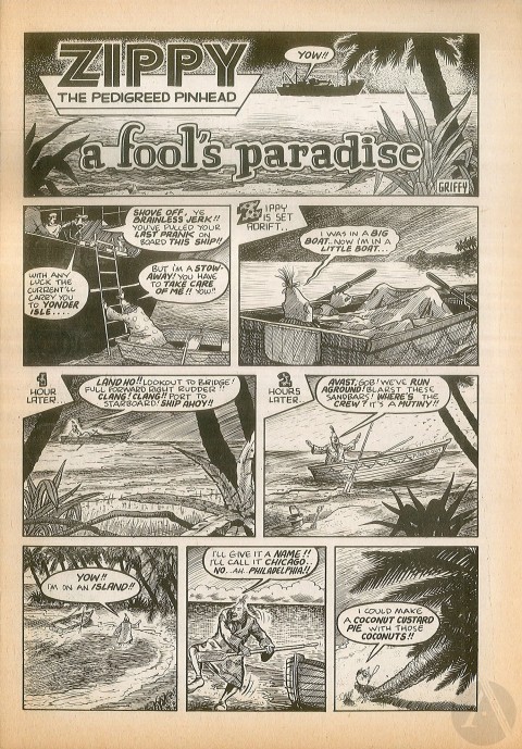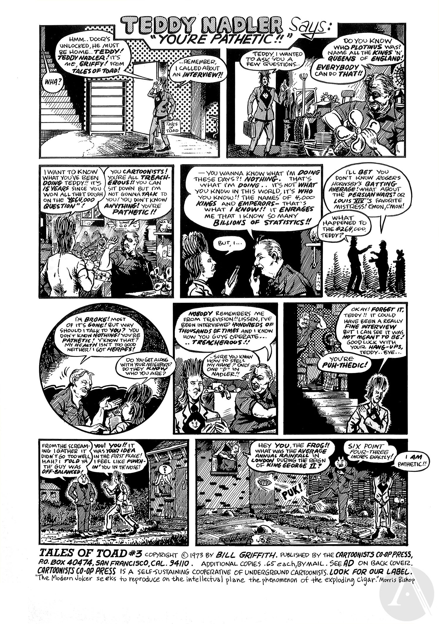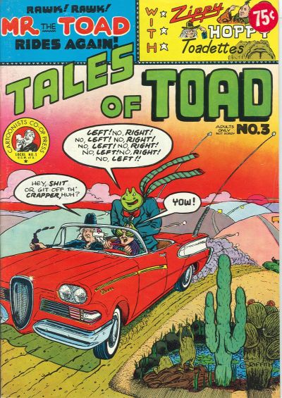 Comic 17 x 26 cm 36 pages → Offset ↪ US ↪ San Francisco Parution en decembre 1973Tales Of Toad n°3 par : Griffith (Bill) Numerisation : Oui (150 dpi) Edition Cartoonists Co-Op Press Collection privée PLUS MOINS