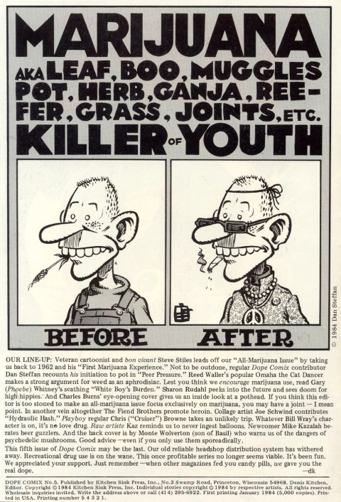 Comic 36 pages → Offset ↪ US ↪ Princeton Parution en janvier 1984Dope Comix n°5 Numerisation : Oui (150 dpi) Edition Kitchen Sink En ligne sur archive.org PLUS MOINS