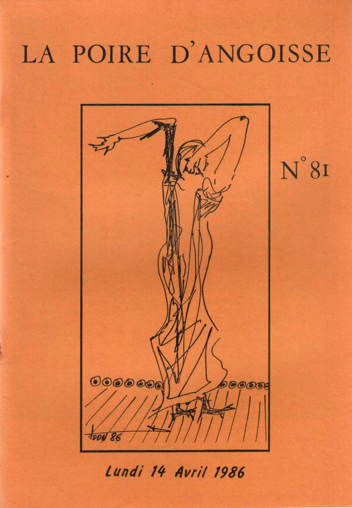 A5 → Photocopie NB ↪ FR ↪ 24 ↪ Boulazac Parution en avril 1986La Poire D'Angoisse n°81 chez : Moulinier (Didier) Numerisation : Non En recherche PLUS MOINS