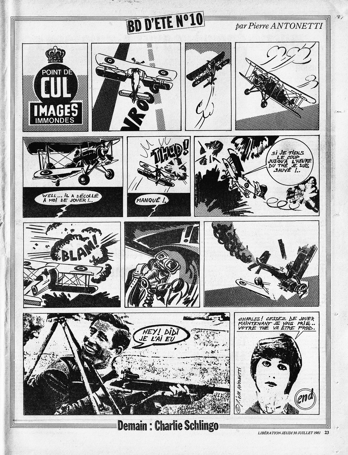 28 x 36 cm → Offset ↪ FR Parution en juillet 1981Libération (Bédé d'été 10 Pierre Antonetti) chez : Libération Numerisation : Oui (300 dpi) Collection privée PLUS MOINS