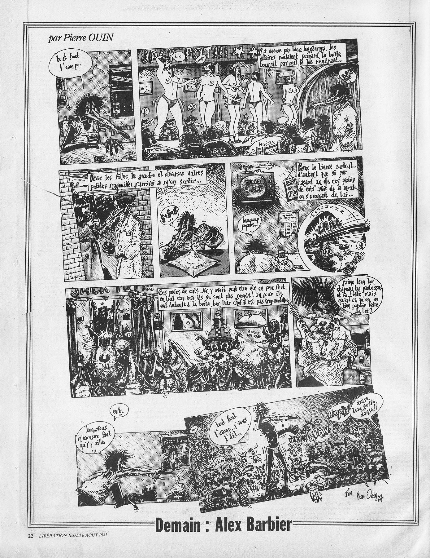 28 x 36 cm → Offset ↪ FR Parution en aout 1981Libération (Bédé d'été 16 Ouin) par : Ouin (Pierre) chez : Libération Numerisation : Oui (300 dpi) Collection privée PLUS MOINS