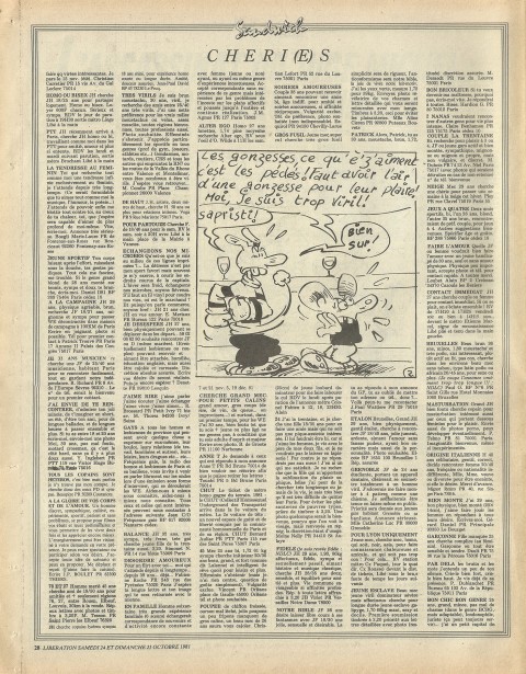 28 x 36 cm 3 pages → Offset ↪ FR Parution en octobre 1981Libération (Schlingo) par : Schlingo (Charlie) chez : Libération Numerisation : Oui (300 dpi) Collection privée PLUS MOINS