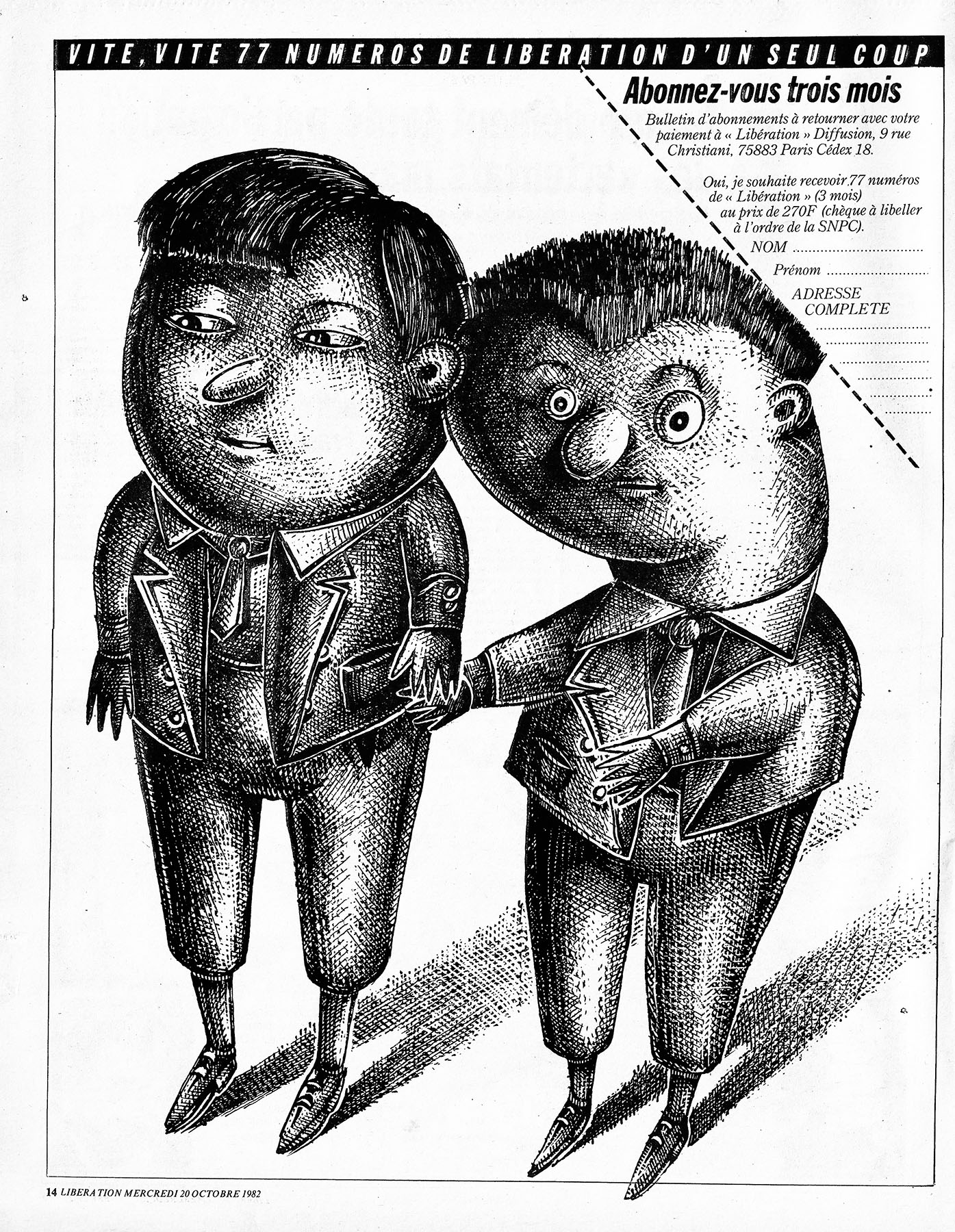 28 x 36 cm 1 pages → Offset ↪ FR Parution en octobre 1982Libération (Doury) par : Doury (Pascal) chez : Libération Numerisation : Oui (300 dpi) Collection privée PLUS MOINS