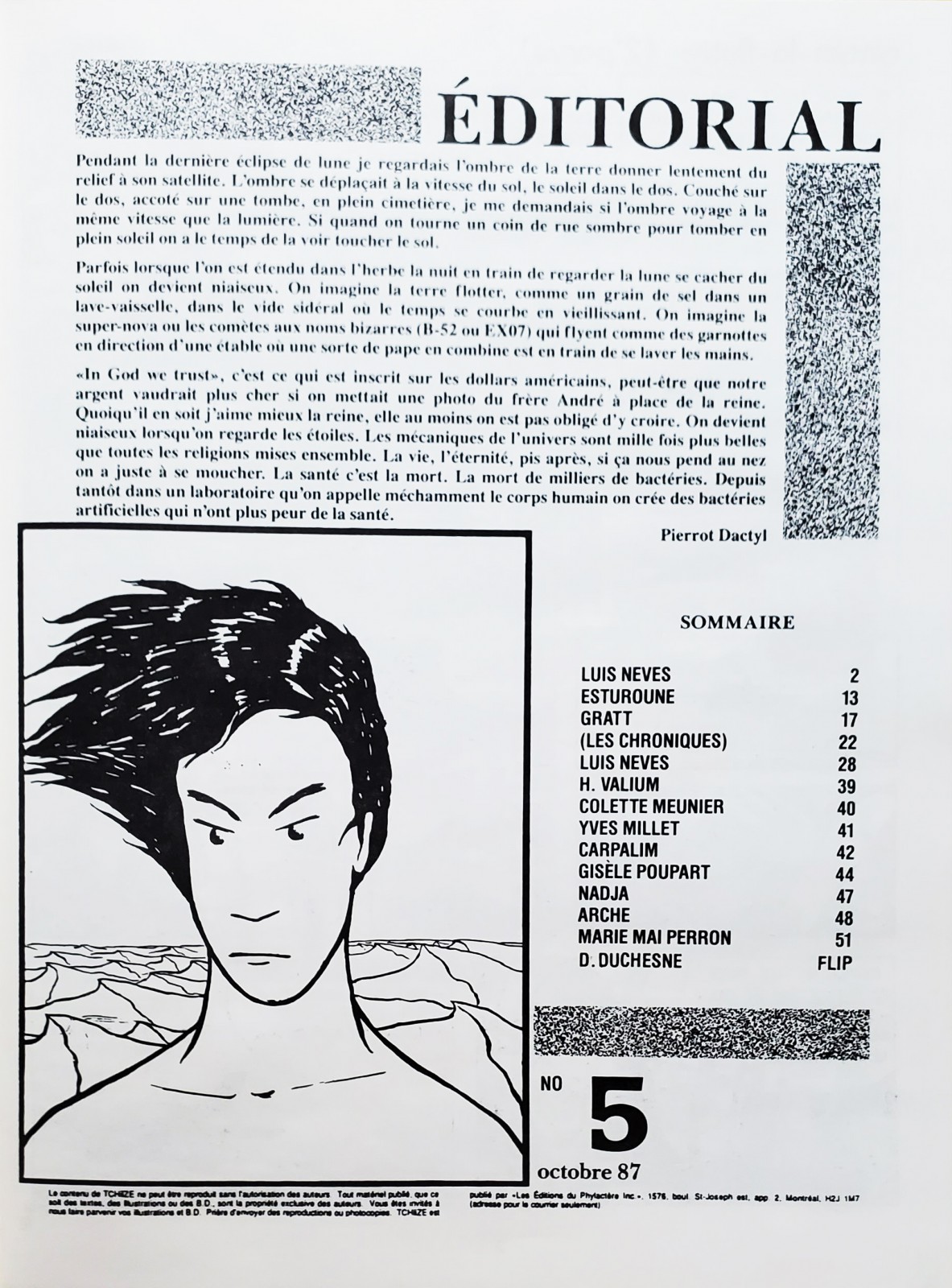 21.5 x 28 cm 68 pages → Offset ↪ QC ↪ Montréal Parution en octobre 1987Tchiize n°5 bis Numerisation : Oui (150 dpi) Collection Banq Montréal PLUS MOINS