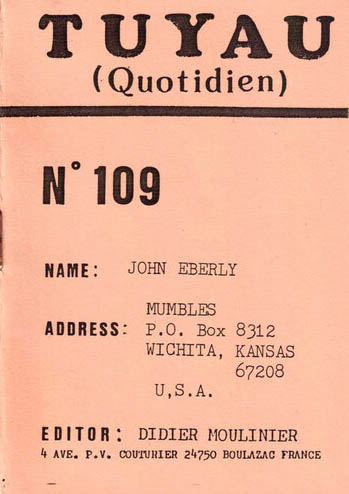 A7 16 pages → Photocopie NB ↪ FR ↪ 24 ↪ Périgueux Parution en avril 1987Tuyau Quotidien n°109 - John Eberly chez : Moulinier (Didier) Numerisation : Oui En ligne sur Tape-mag PLUS MOINS
