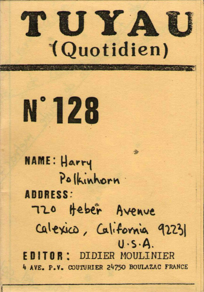 A7 16 pages → Photocopie NB ↪ FR ↪ 24 ↪ Périgueux Parution en mai 1987Tuyau Quotidien n°128 - Harry Polkinhorn chez : Moulinier (Didier) Numerisation : Non En attente PLUS MOINS