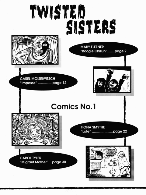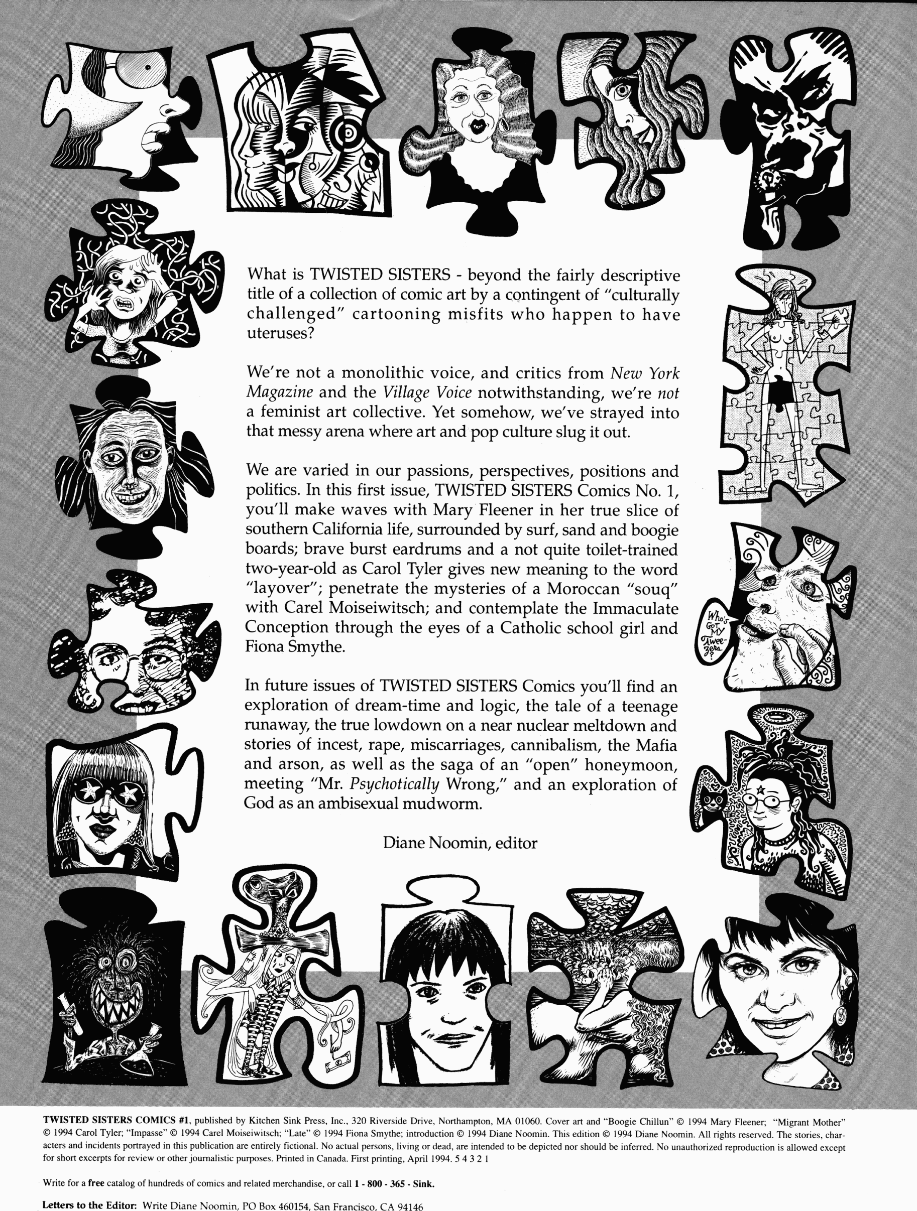 Comic 21.4 x 27.9 cm 44 pages → Offset ↪ US ↪ Princeton Parution en avril 1994Twisted Sisters n°1 Numerisation : Oui (150 dpi) Edition Kitchen Sink En ligne sur archive.org PLUS MOINS