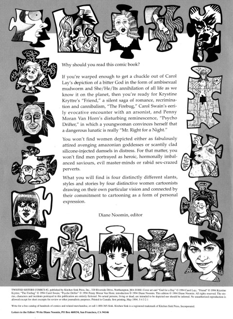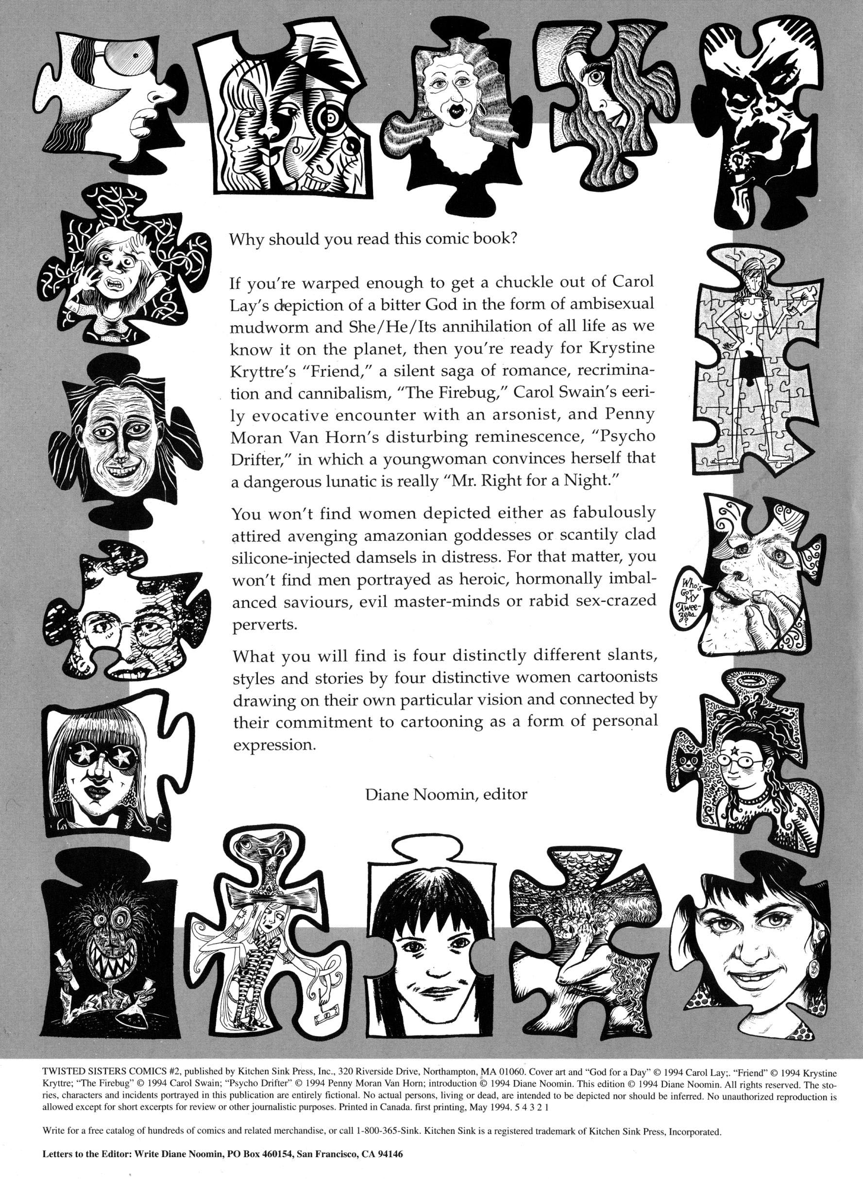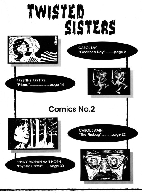 Comic 21.4 x 27.9 cm 44 pages → Offset ↪ US ↪ Princeton Parution en mai 1994Twisted Sisters n°2 Numerisation : Oui (150 dpi) Edition Kitchen Sink En ligne sur archive.org PLUS MOINS