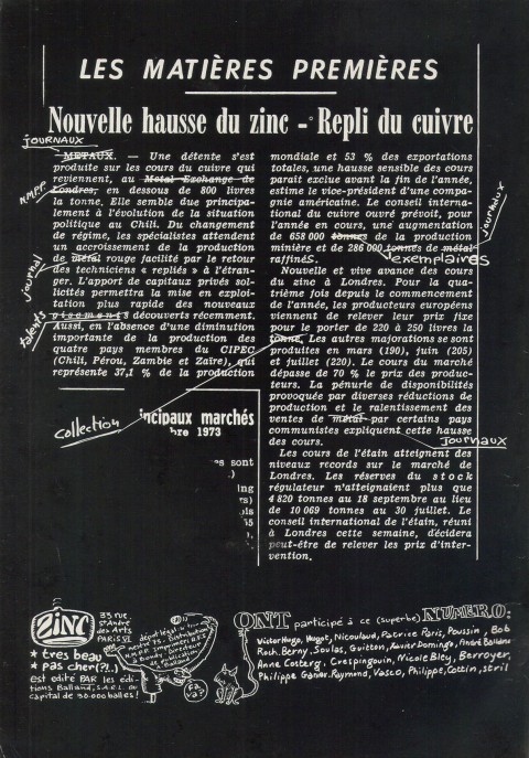 A4 52 pages → Offset ↪ FR ↪ Paris Parution en octobre 1973Zinc n°15 Numerisation : Oui (300 dpi) Collection privée PLUS MOINS