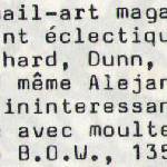 Mail art et Copy-art (international) en provenance de San Francisco dans la 2° partie des années 80 et qui tend vers le graphzine, avec Bruno Richard, Françoise Duvivier, Dominique Leblanc et Cripure dans les n°3 et/ou 4 de 1988 qui y représentent la France.