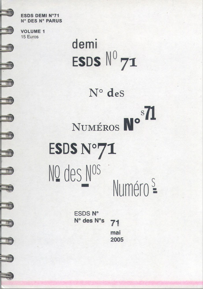A5 44 pages → Photocopie couleur → Photocopie NB ↪ FR Parution en mai 2005Esds n°71 - N° des n°s par : Elles Sont De Sortie Auto édition Numerisation : Non En recherche PLUS MOINS