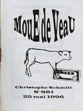A7 16 pages → Photocopie NB ↪ FR ↪ 62 Parution en mai 1996Moue de Veau n°881 (Christophe Schmitt) par : Suel (Lucien) Auto édition Numerisation : Non En recherche PLUS MOINS