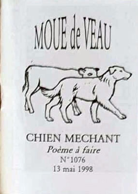 A7 16 pages → Photocopie NB ↪ FR ↪ 62 ↪ Berguette Parution en mai 1998Moue de Veau n°1076 (Chien Méchant) par : Suel (Lucien) Auto édition Numerisation : Non En recherche PLUS MOINS