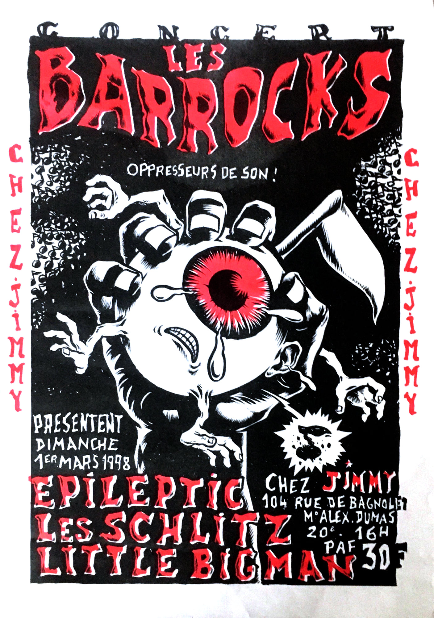 1 pages → Sérigraphie ↪ FR ↪ Paris Parution en mars 1998Barrocks Chez Jimmy chez : Barrocks (Les) Numerisation : Oui En ligne sur Facebook PLUS MOINS