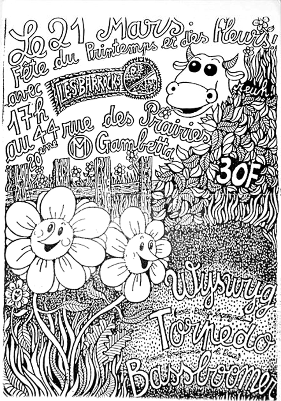 1 pages → Photocopie NB ↪ FR ↪ Paris Parution en 1991Barrocks 21 mars Rue des Prairies chez : Barrocks (Les) Numerisation : Oui En ligne sur Facebook (Date approximative) PLUS MOINS