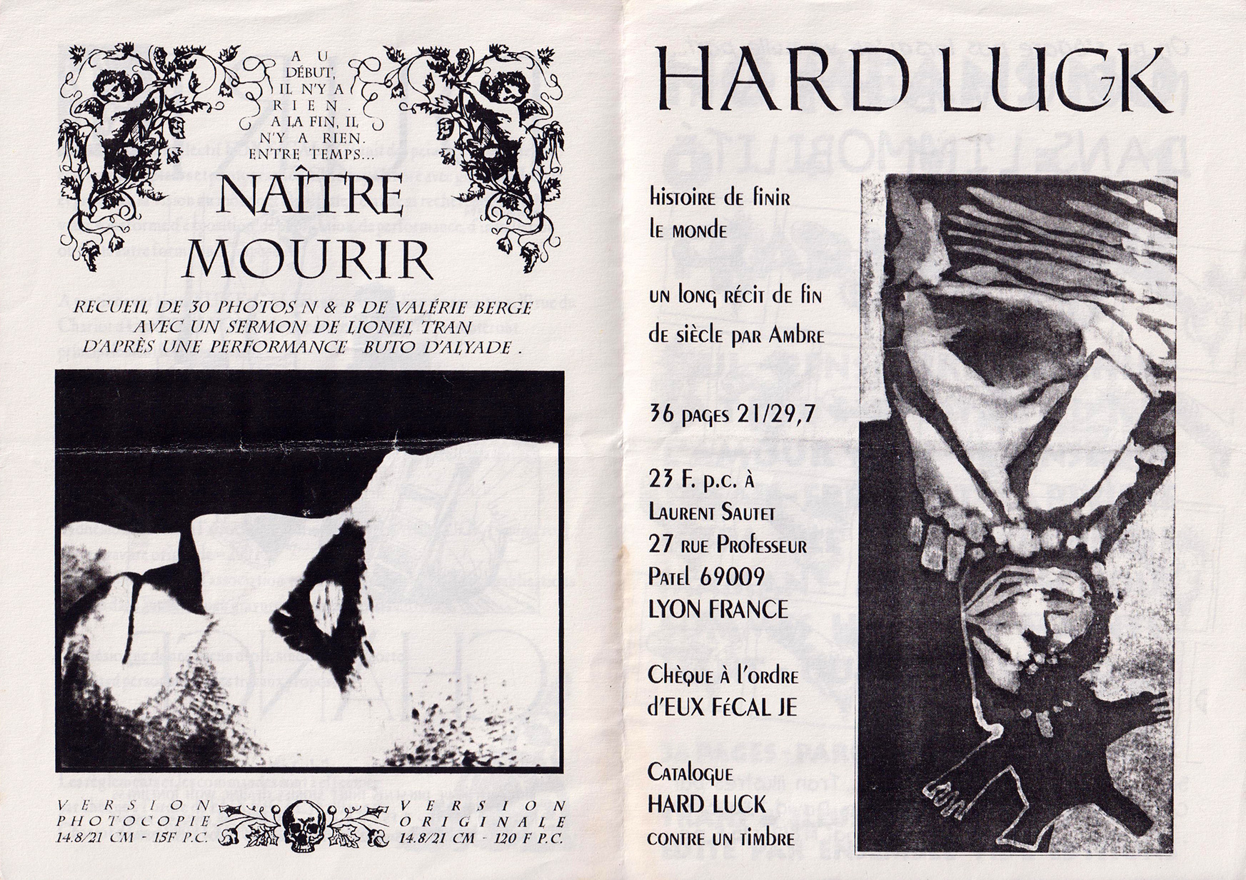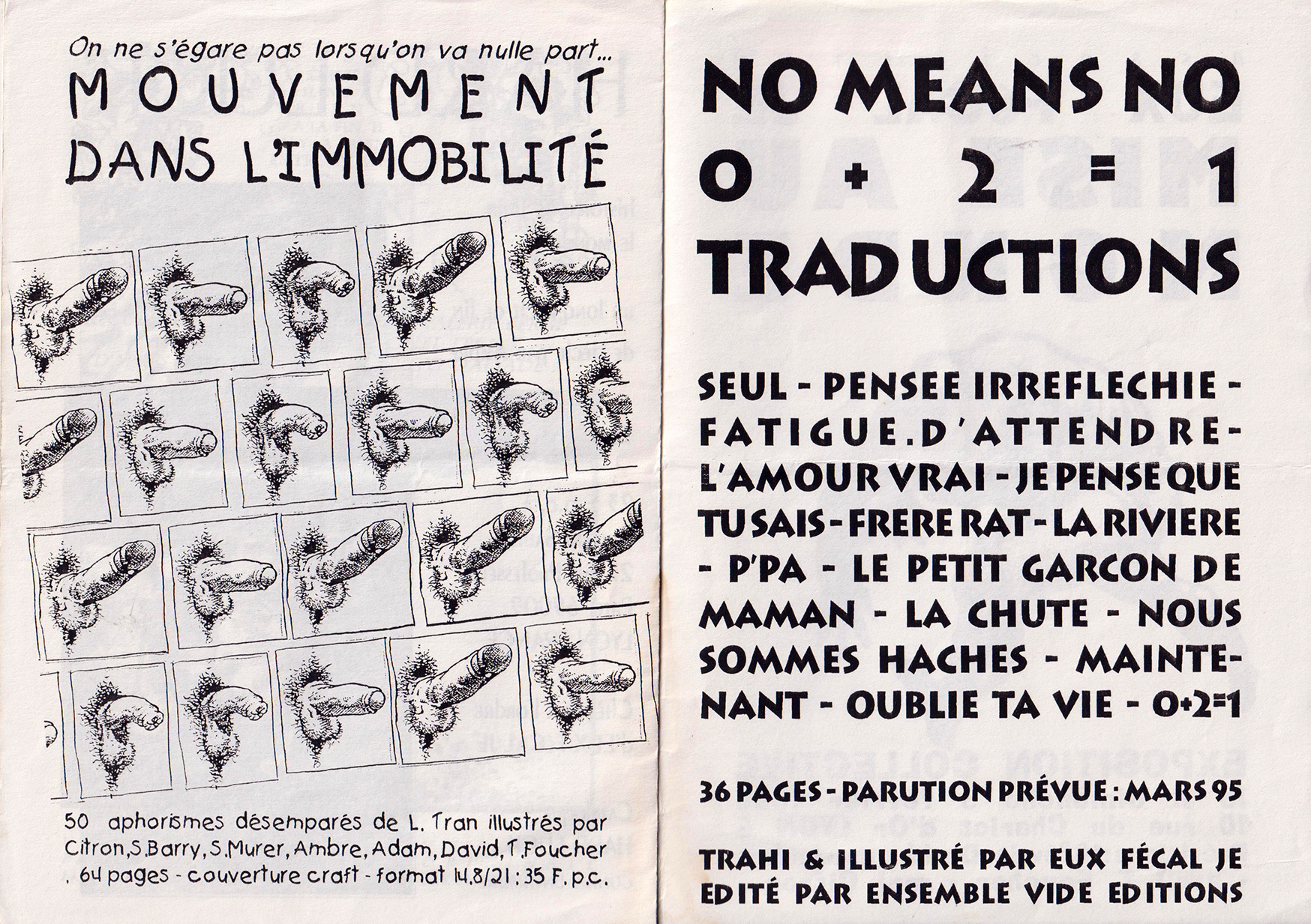 A5 8 pages → Photocopie NB ↪ FR ↪ 69 ↪ Lyon Parution en decembre 1994Catalogue n°6 chez : Eux Fécal Je Numerisation : Oui (300 dpi) Collection privée PLUS MOINS