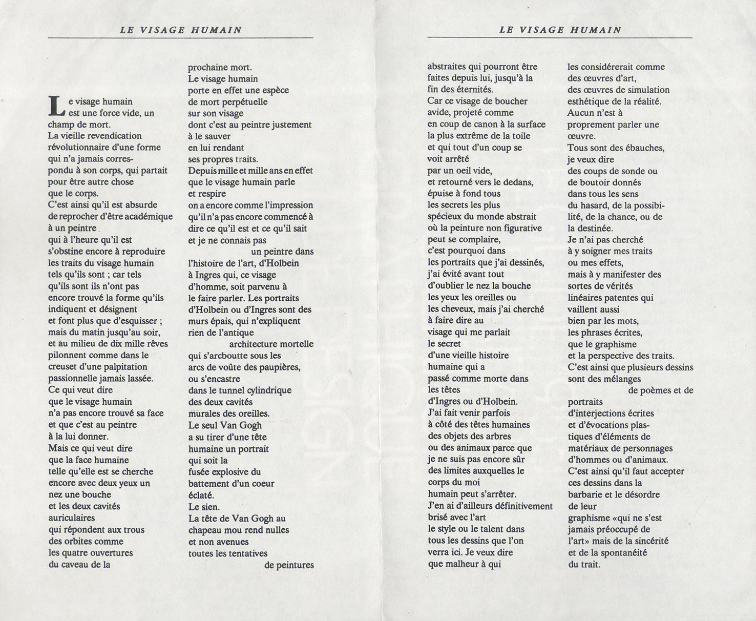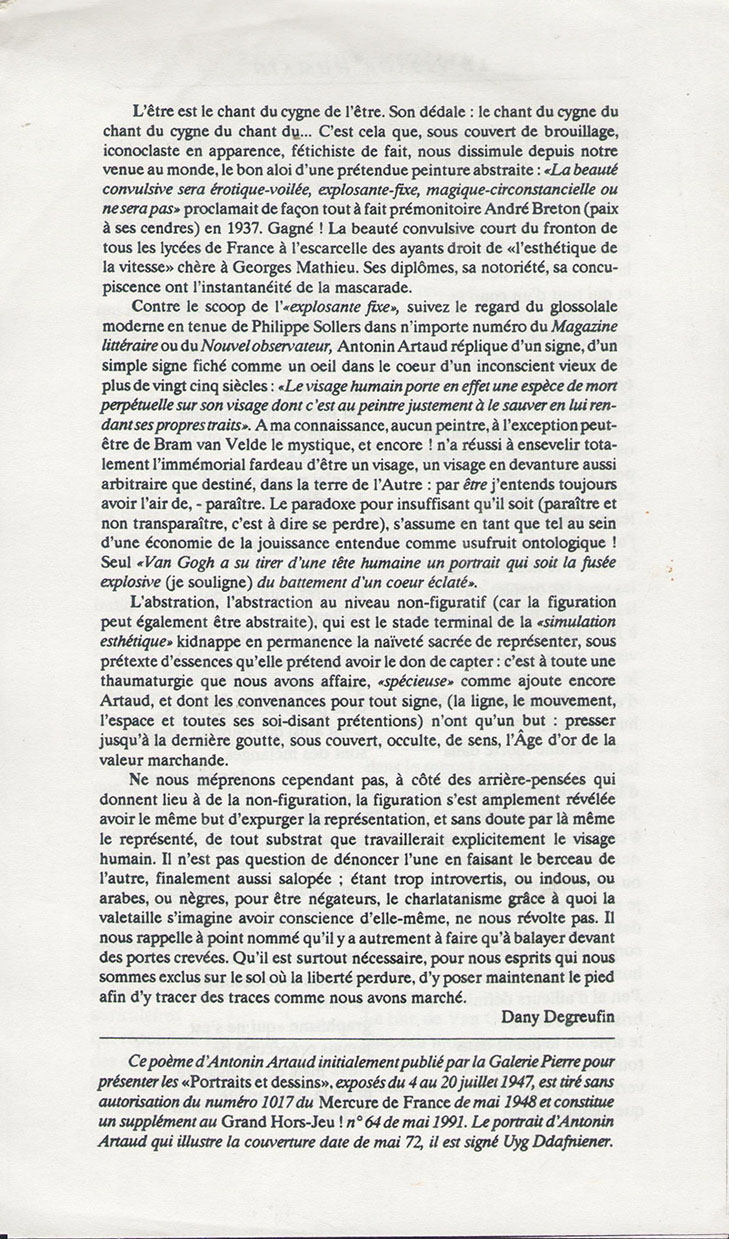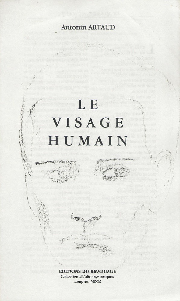 4 pages → Photocopie NB ↪ FR ↪ 59 ↪ Lompret Parution en 1990Le Visage Humain (Artaud) chez : Rewidiage Numerisation : Oui (300 dpi) Collection privée PLUS MOINS