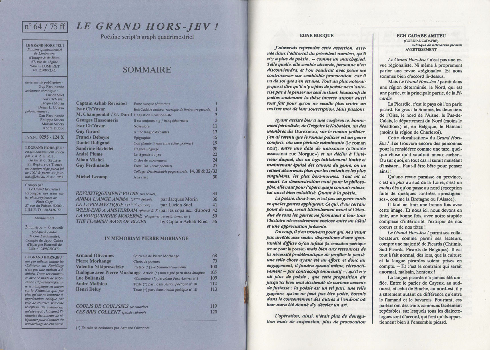 A5 116 pages → Photocopie NB ↪ FR ↪ 59 ↪ Lompret Parution en mai 1991Le Grand Hors-Jeu n°64 chez : Rewidiage Numerisation : Oui (300 dpi) Collection privée PLUS MOINS
