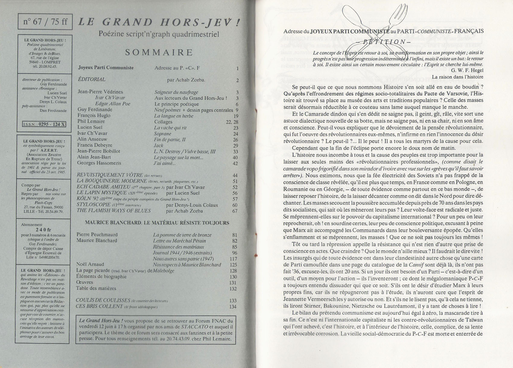 A5 132 pages → Photocopie NB ↪ FR ↪ 59 ↪ Lompret Parution en mai 1992Le Grand Hors-Jeu n°67 chez : Rewidiage Numerisation : Oui (300 dpi) Collection privée PLUS MOINS