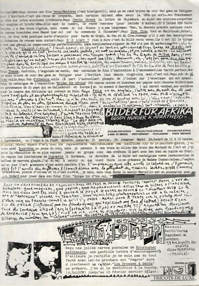 A4 2 pages → Photocopie NB ↪ FR ↪ 66 ↪ Perpignan Parution en janvier 1988Le Cri Du Cétacé n°1 Numerisation : Oui (300 dpi) Collection privée PLUS MOINS