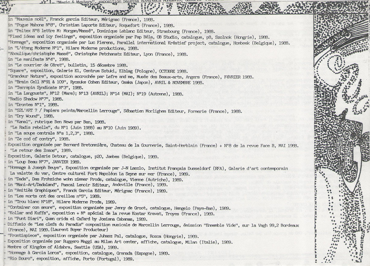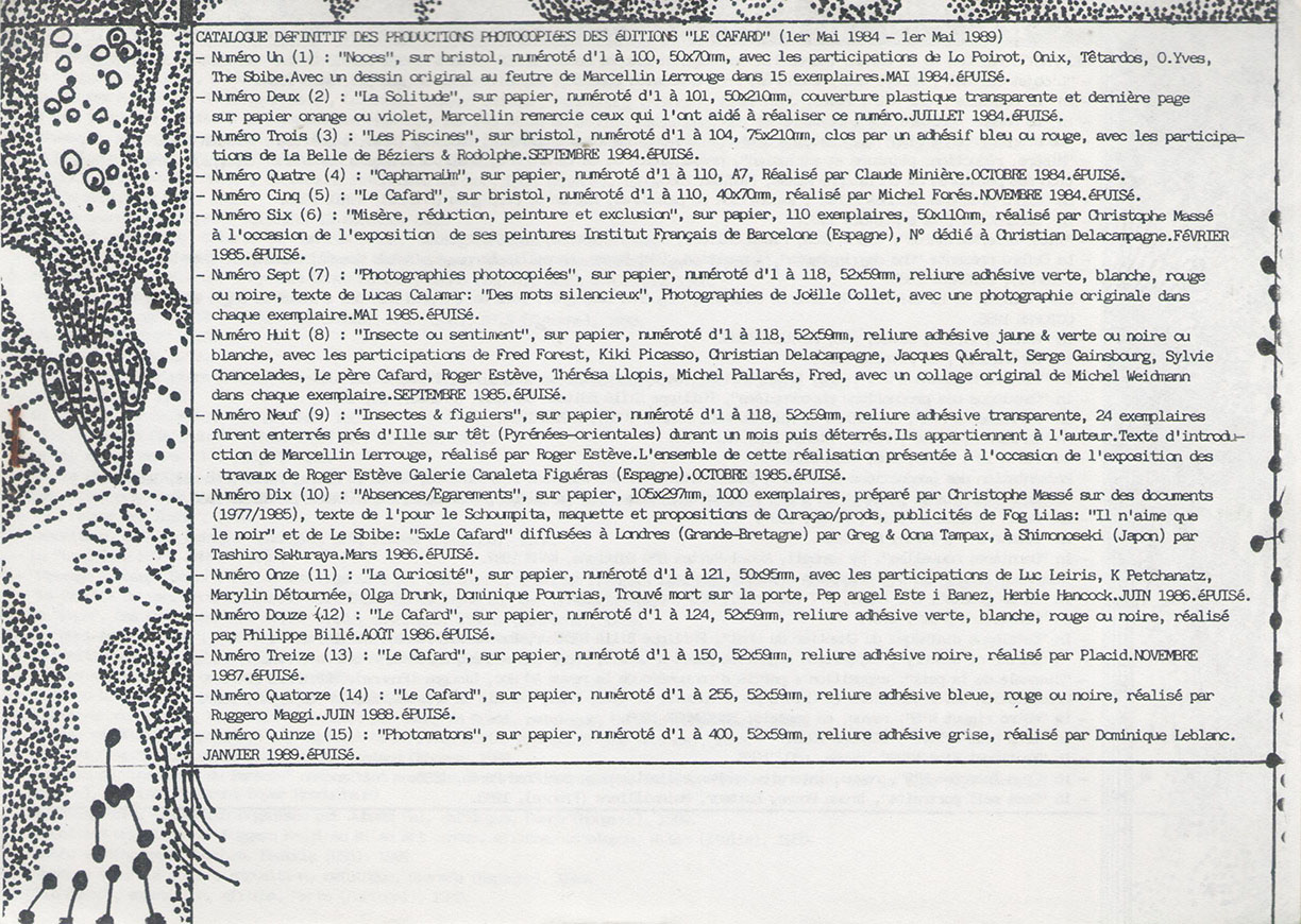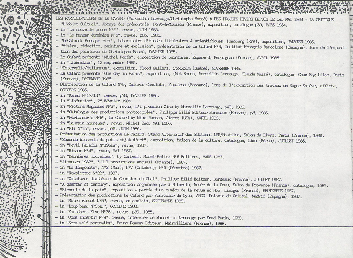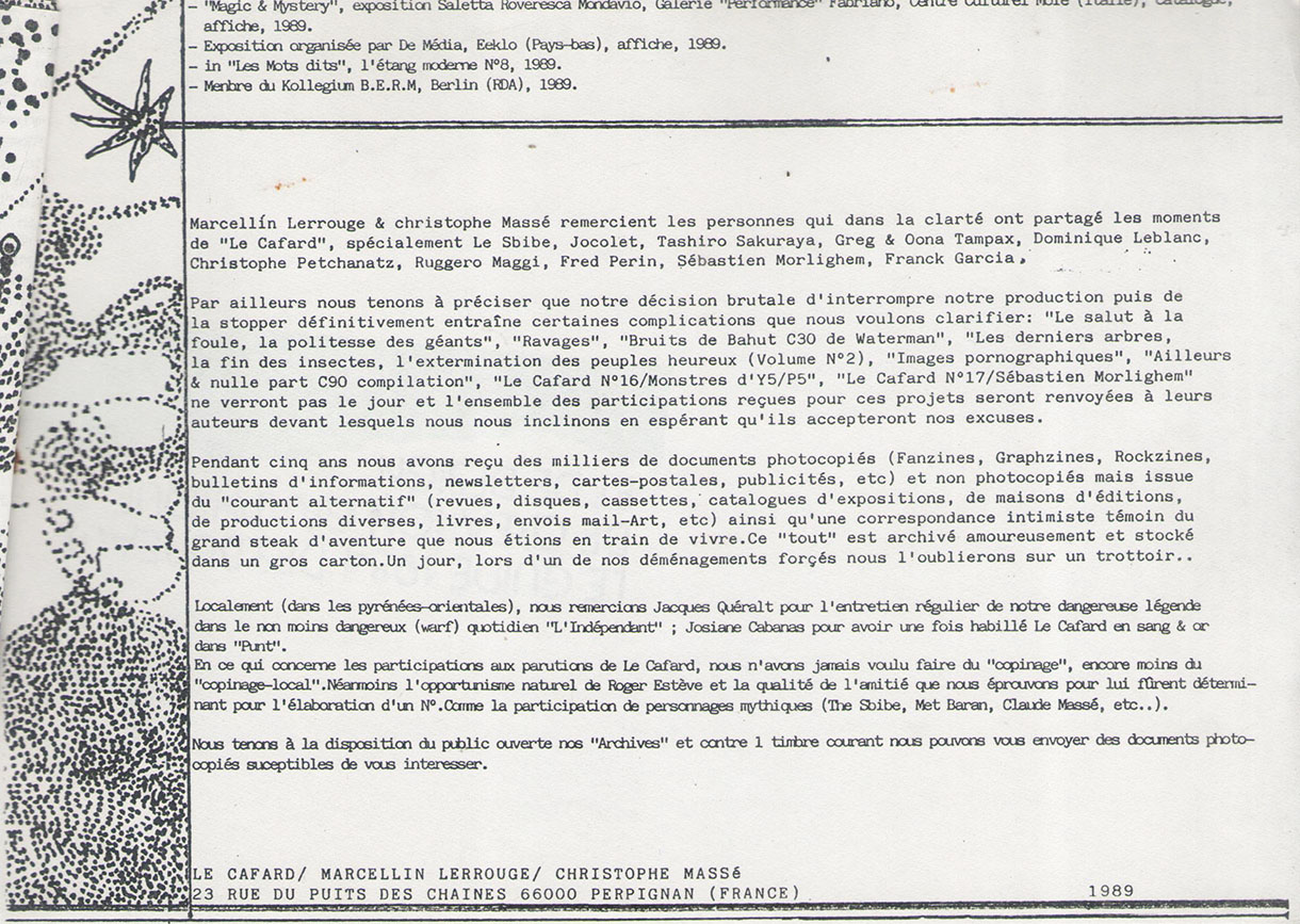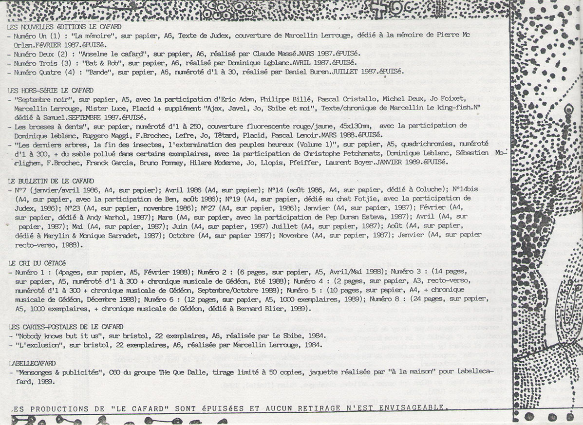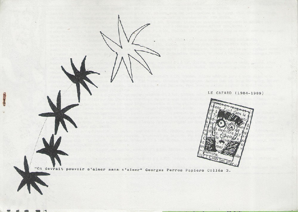A5 6 pages → Photocopie NB ↪ FR ↪ 28 ↪ Mainvillier Parution en mai 1989Le Cafard 1984-1989 Numerisation : Oui (300 dpi) Collection privée PLUS MOINS