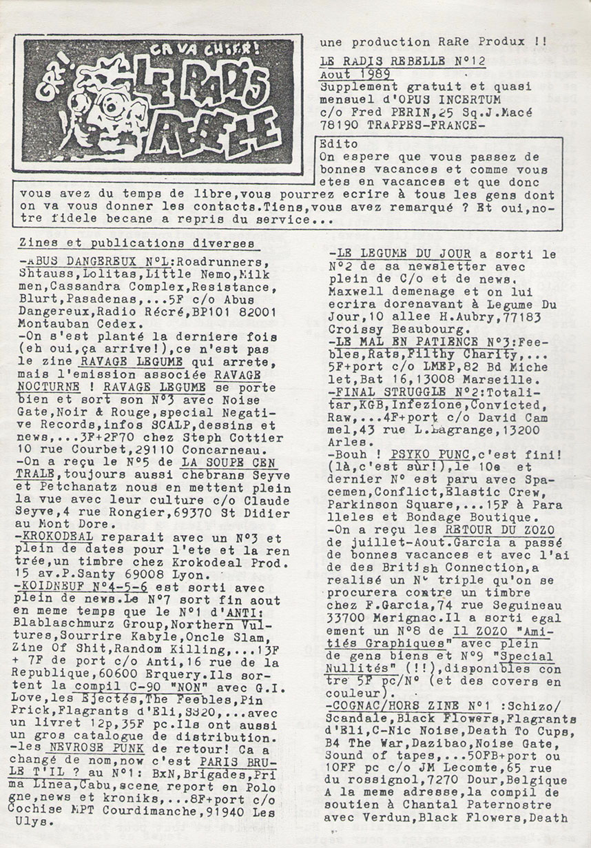 A5 4 pages → Photocopie NB ↪ FR ↪ 78 ↪ Trappes Parution en aout 1989Le Radis Rebelle n°12 Numerisation : Oui (300 dpi) Collection privée PLUS MOINS