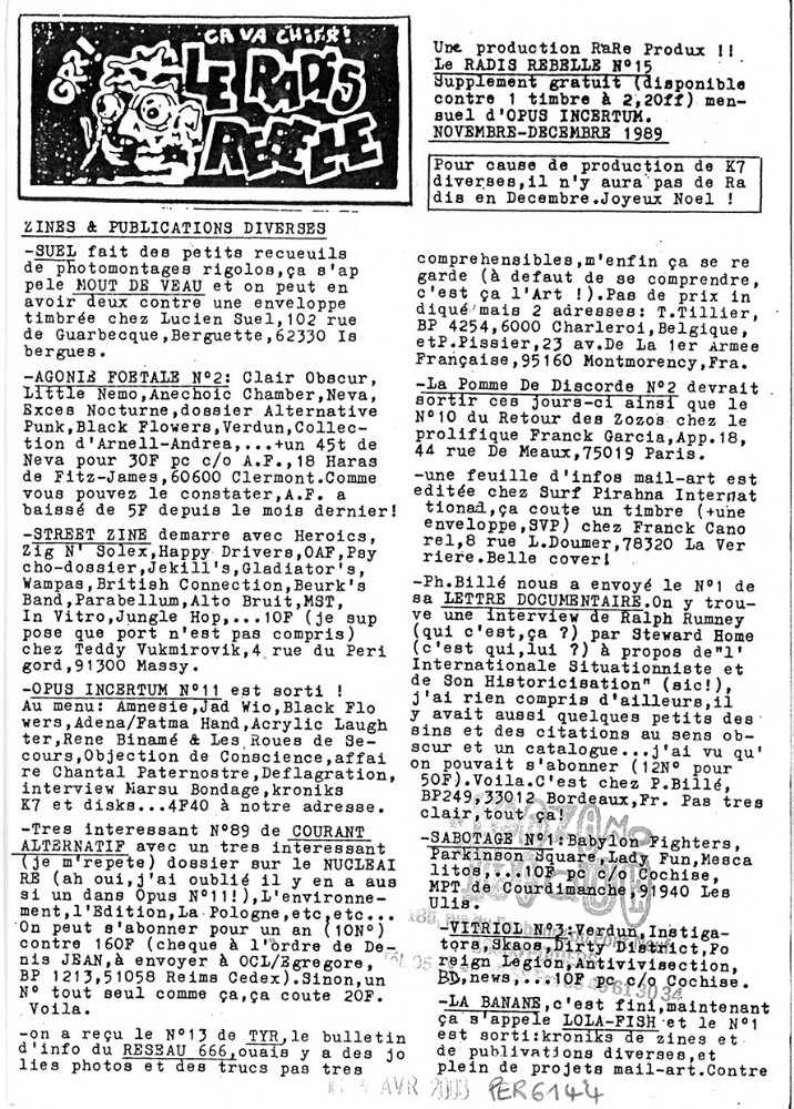 A5 4 pages → Photocopie NB ↪ FR ↪ 78 ↪ Trappes Parution en novembre 1989Radis Rebelle n°15 Numerisation : Oui (300 dpi) Collection Fanzinothèque de Poitiers PLUS MOINS