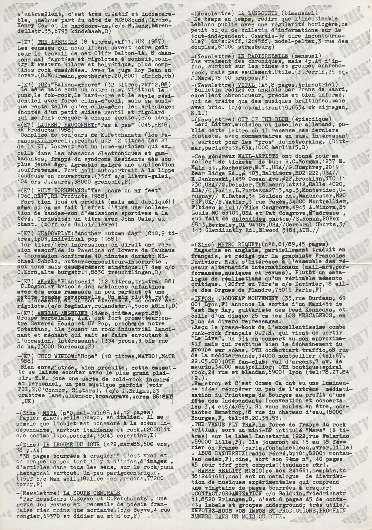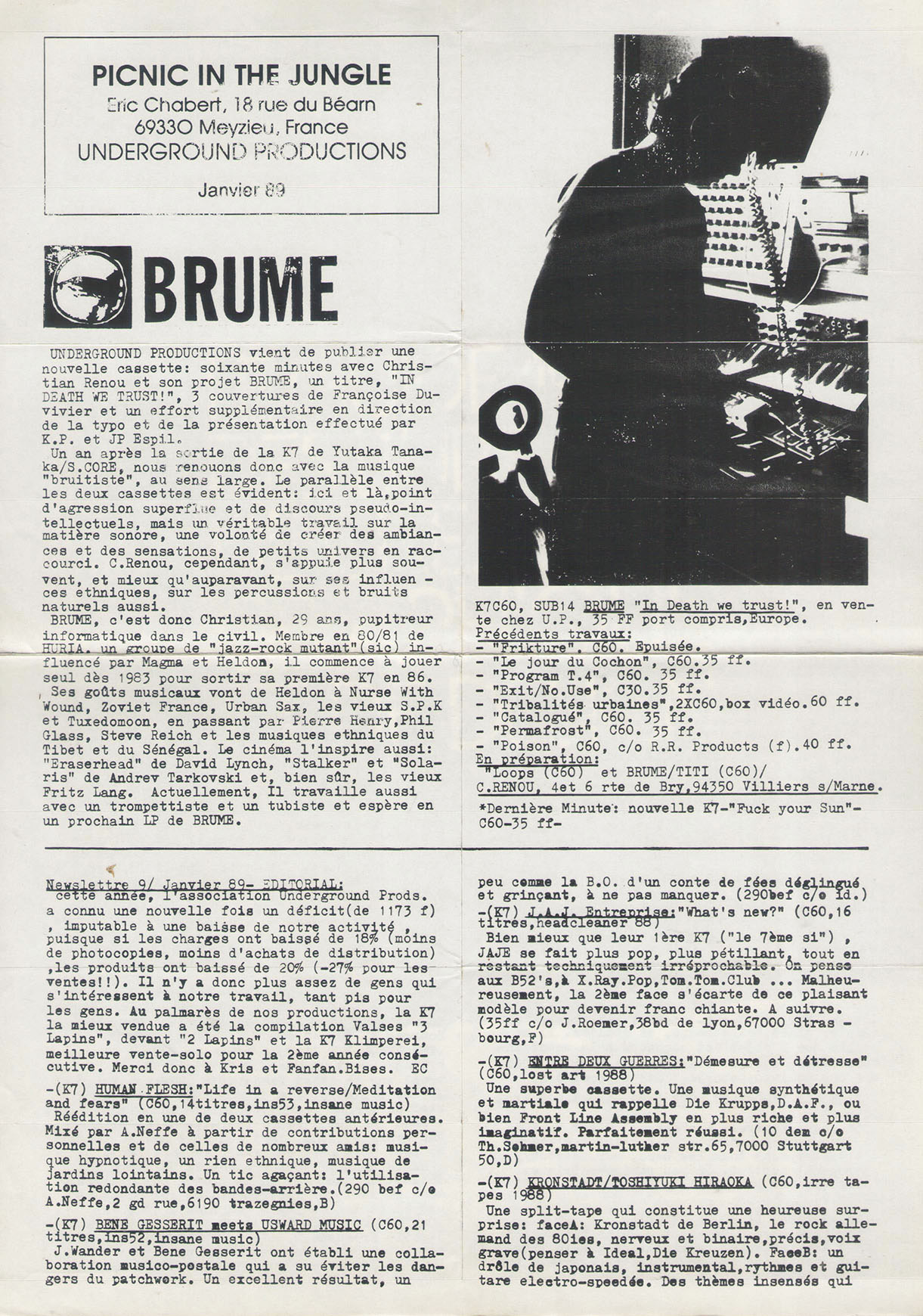 A4 2 pages → Photocopie NB ↪ FR ↪ 69 ↪ Meyzieu Parution en janvier 1989Picnic In The Jungle - Brume Numerisation : Oui (300 dpi) Collection privée PLUS MOINS